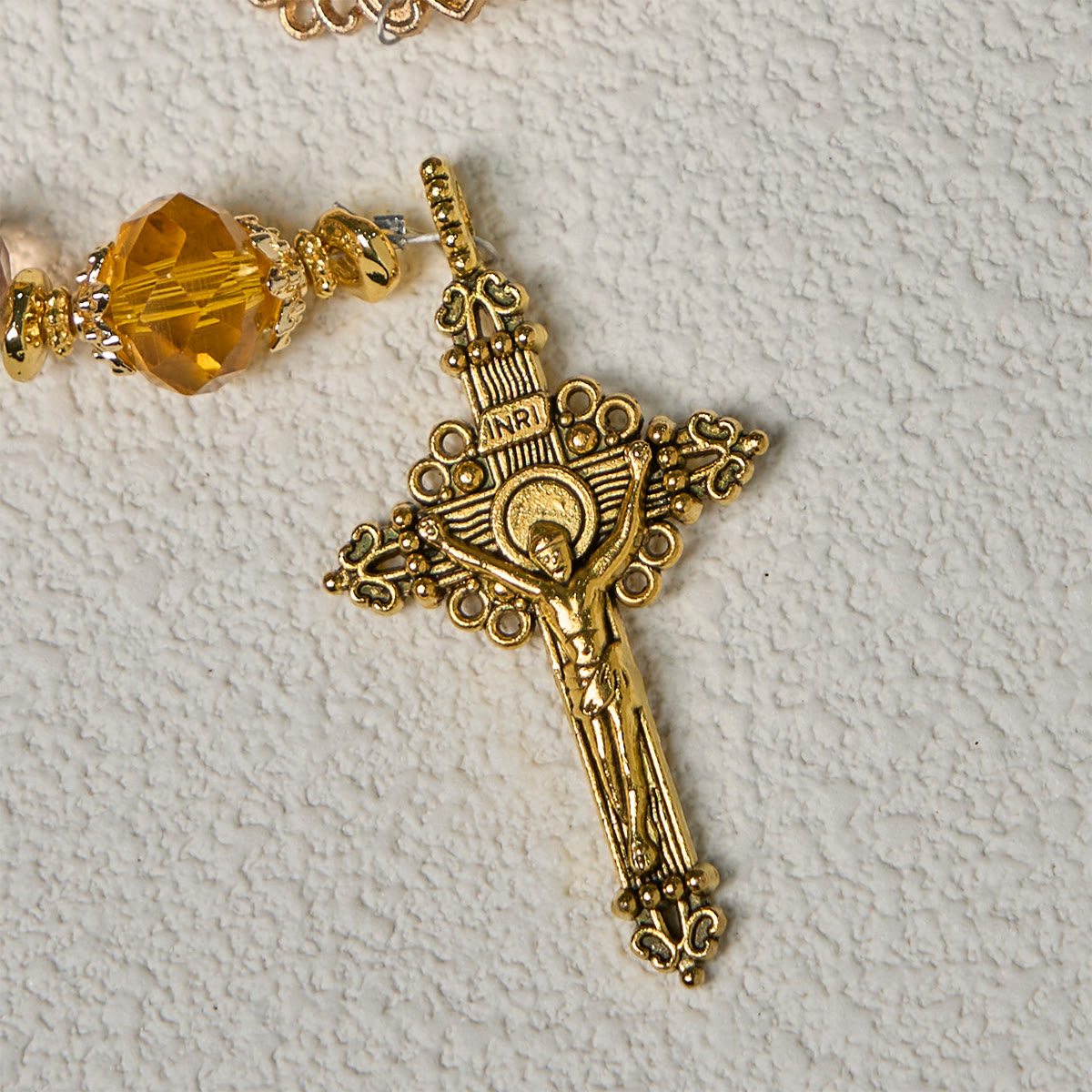 The warm amber beads symbolize light and hope, while the gold-toned crucifix completes the design with a testament to Christ’s sacrifice and victory over death. -