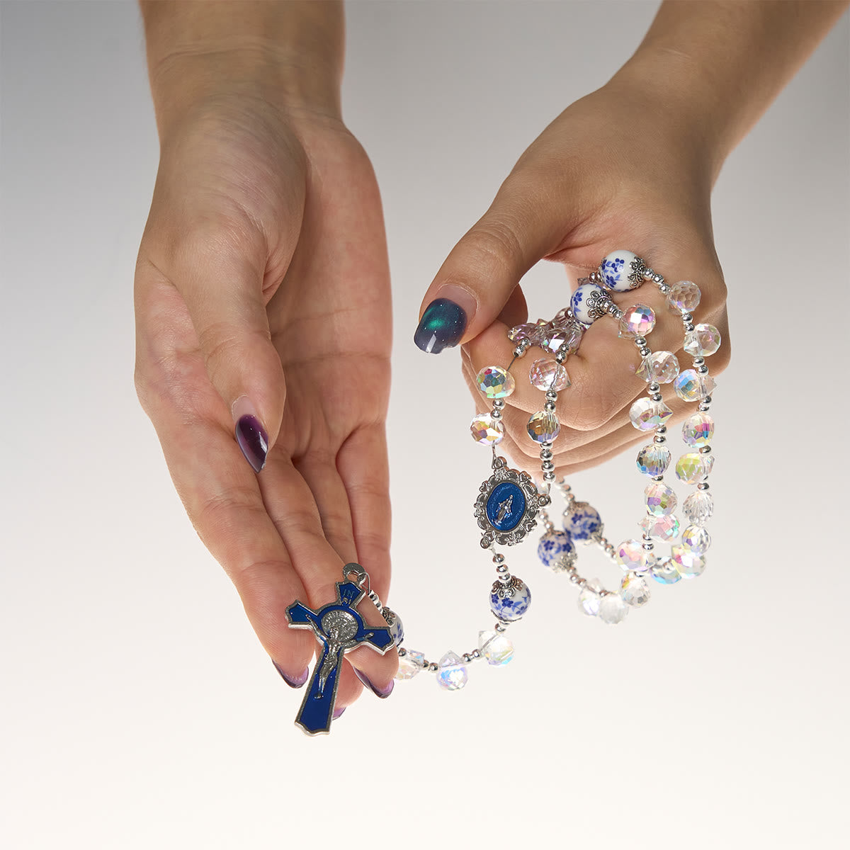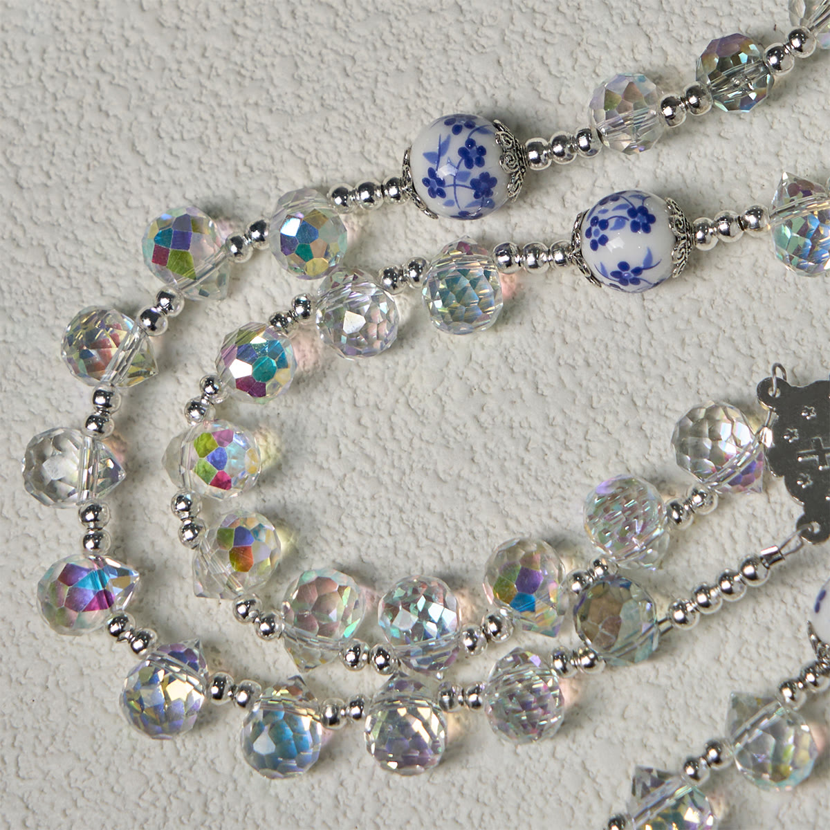 Shining Crystal and Blue Floral Beads Rosary with Enamel Crucifix & Our Lady