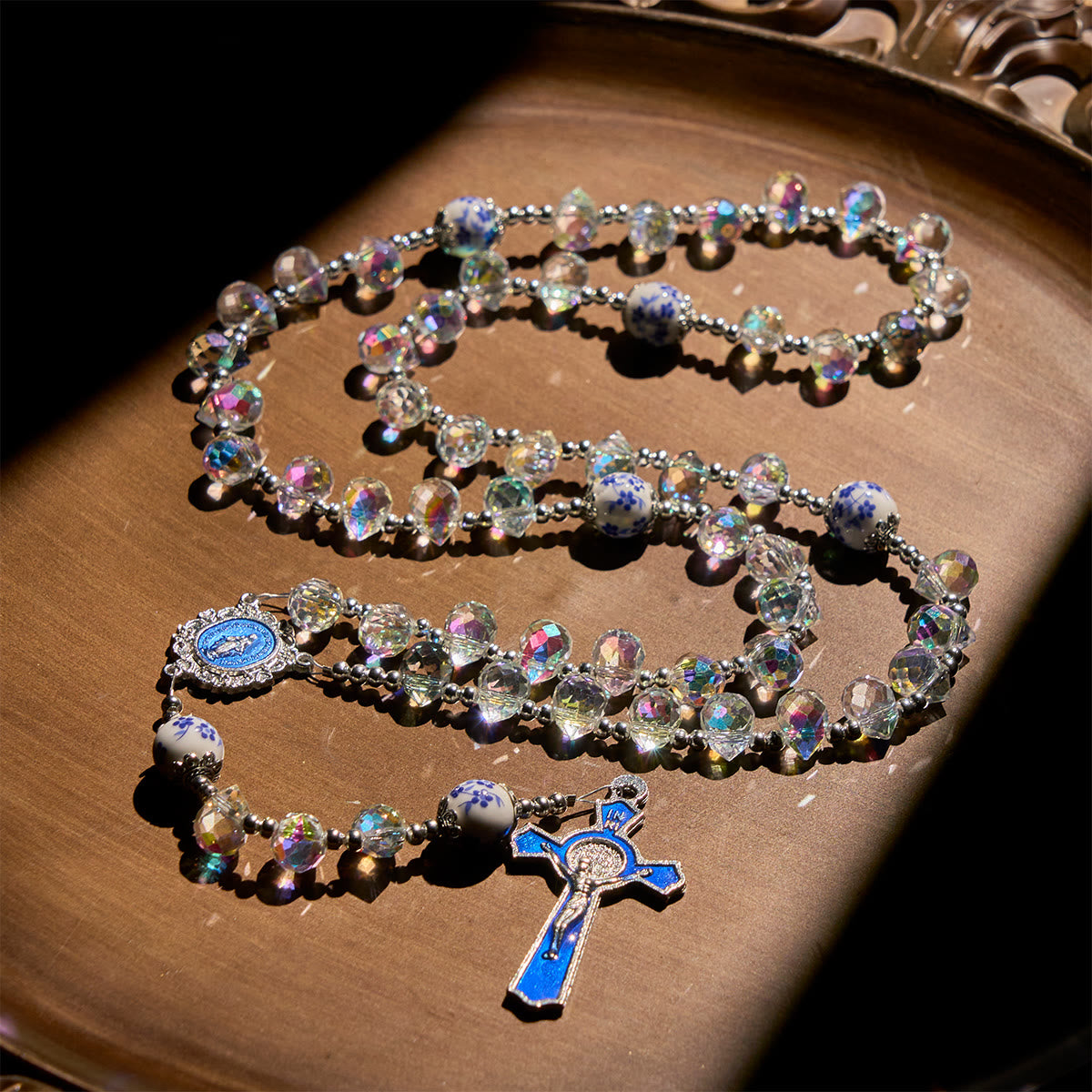 This radiant rosary combines shimmering crystal beads with elegant blue floral accents, echoing the purity and peace of divine devotion. It is more than a prayer tool—it's a symbol of spiritual depth.