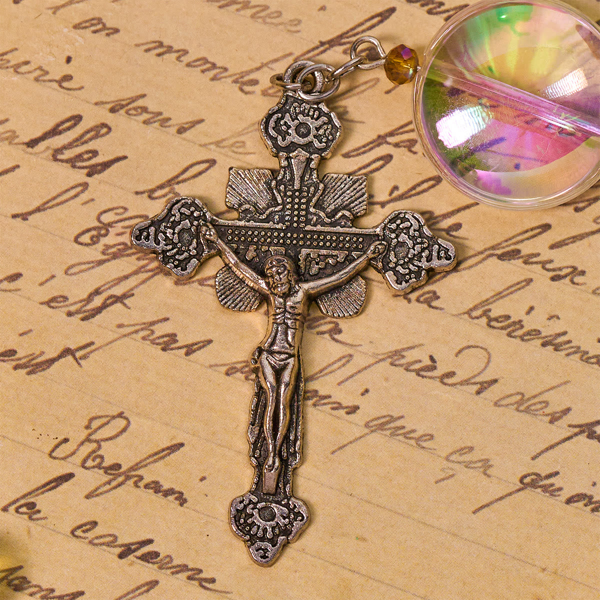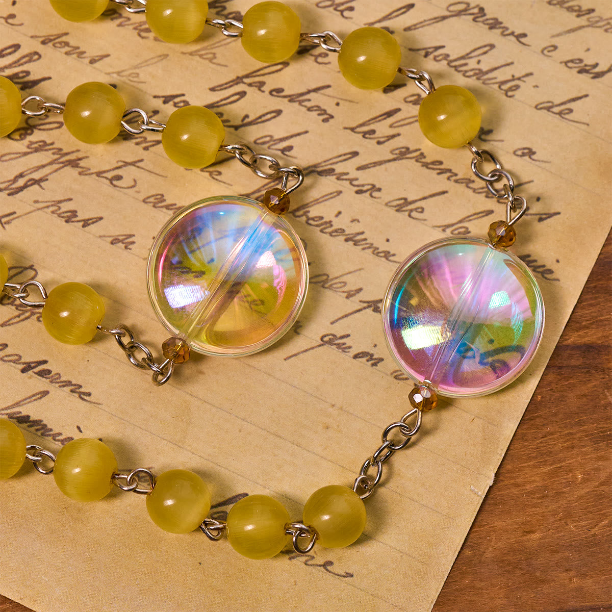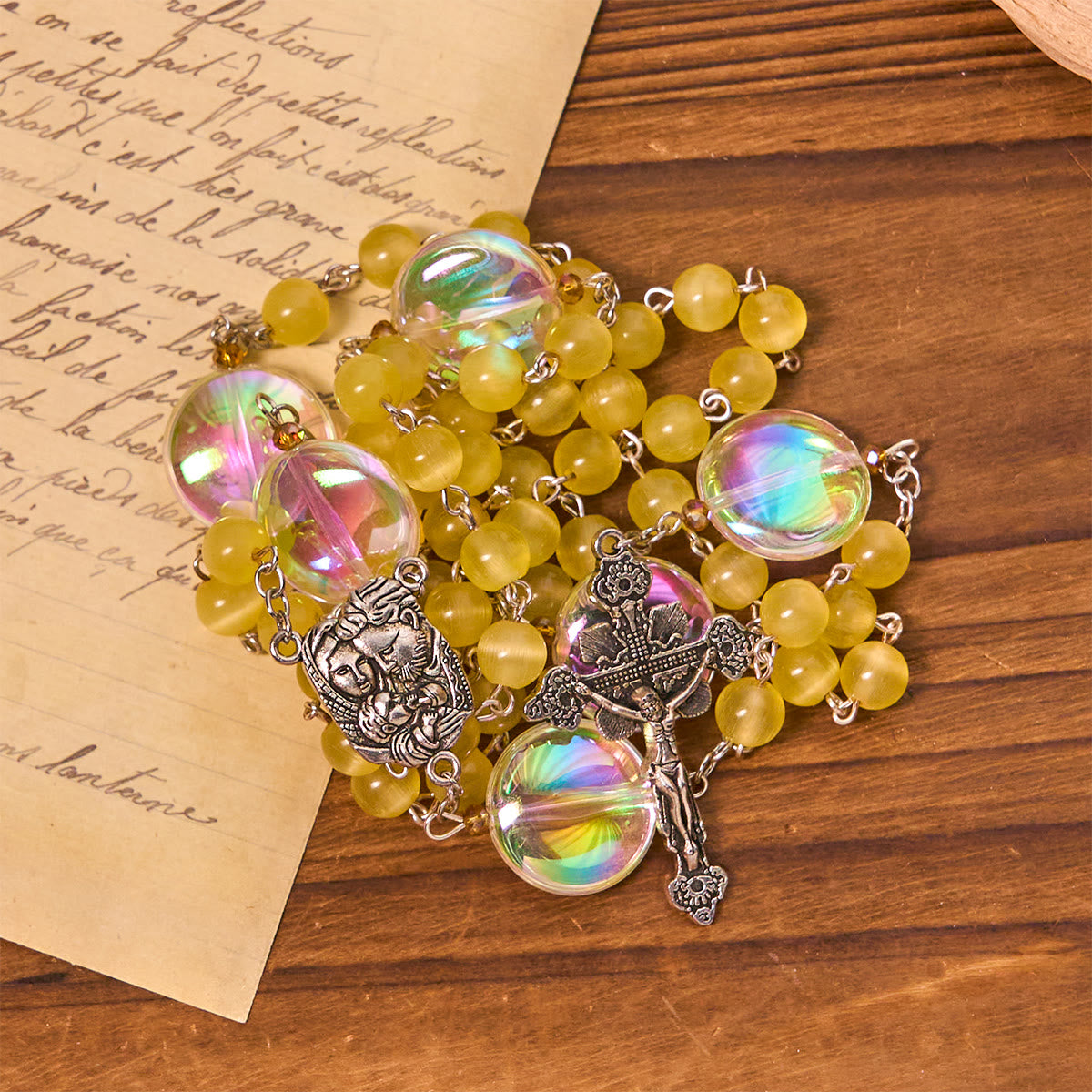 This rosary shines with warm yellow beads symbolizing light, hope, and resurrection. The oversized aurora beads refract rainbow hues, creating a sacred aura that reflects the mystery of God’s glory in prayer. -