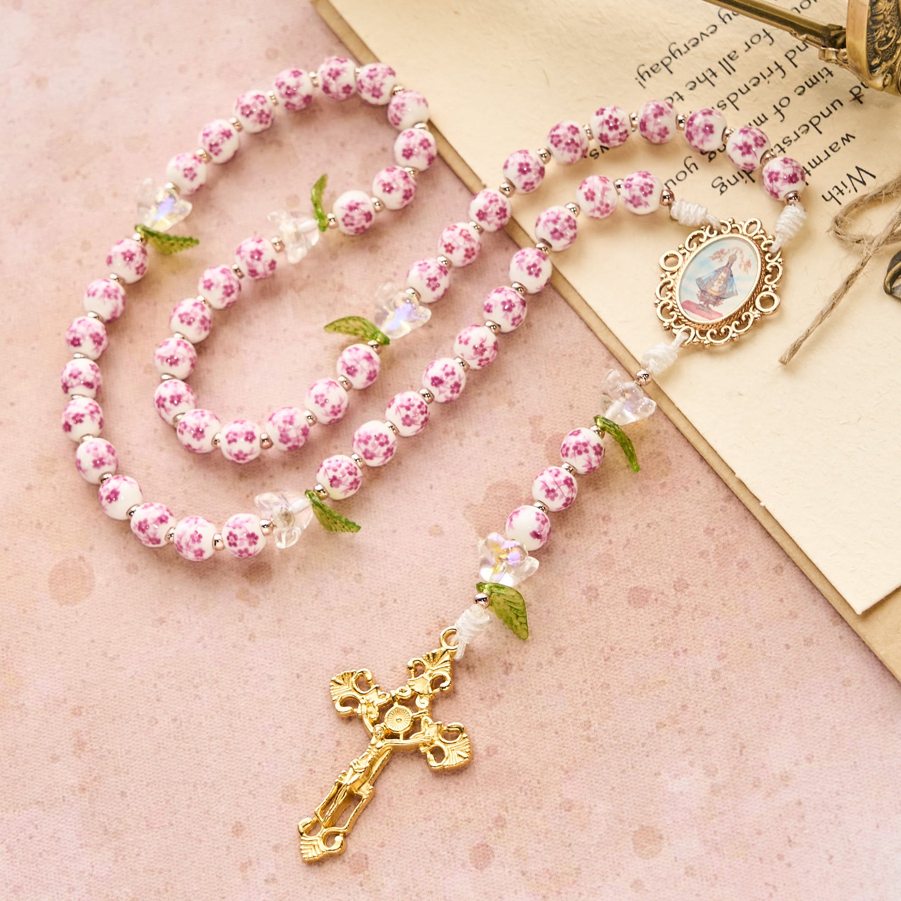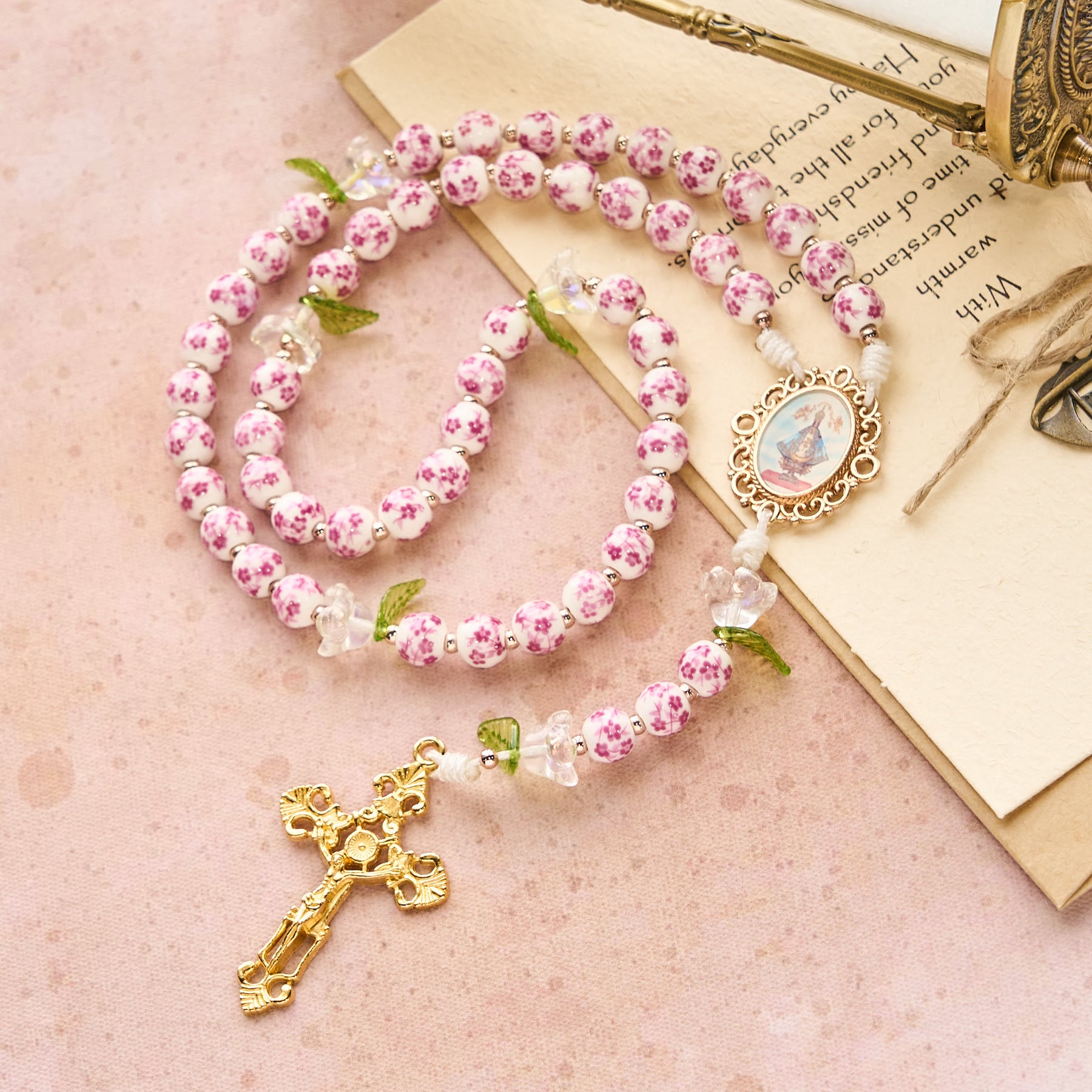 The pink-and-white porcelain beads, paired with lily-of-the-valley accents, flow toward the golden crucifix, weaving each prayer into a tapestry of faith. It merges floral elegance with sacred symbolism, honoring spiritual connection’s beauty. -