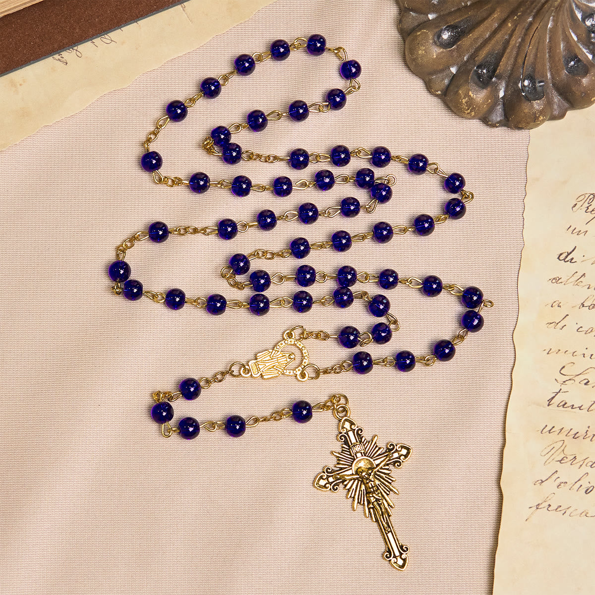 Velvet blue glass beads hold tranquil depth, flowing to a gleaming Miraculous Medal and solemn INRI crucifix—each element anchors blessed faith in eternal light. -