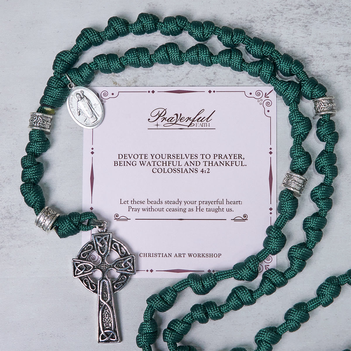 Crafted from green paracord, this rosary pays homage to St. Patrick, the patron saint of Ireland. Green symbolizes new life, growth, and the lush landscapes of Ireland, reflecting the vitality of our faith journey. As stated in Psalm 92:12, "The righteous will flourish like a palm tree, they will grow like a cedar of Lebanon." - The evenly - spaced knots represent the steps on our path to spiritual enlightenment. The Celtic - style cross pendant is an iconic Irish Christian symbol, signifying the intersection of the earthly and the divine. The medallion featuring St. Patrick serves as a reminder of his missionary work and his role in bringing Christianity to Ireland.