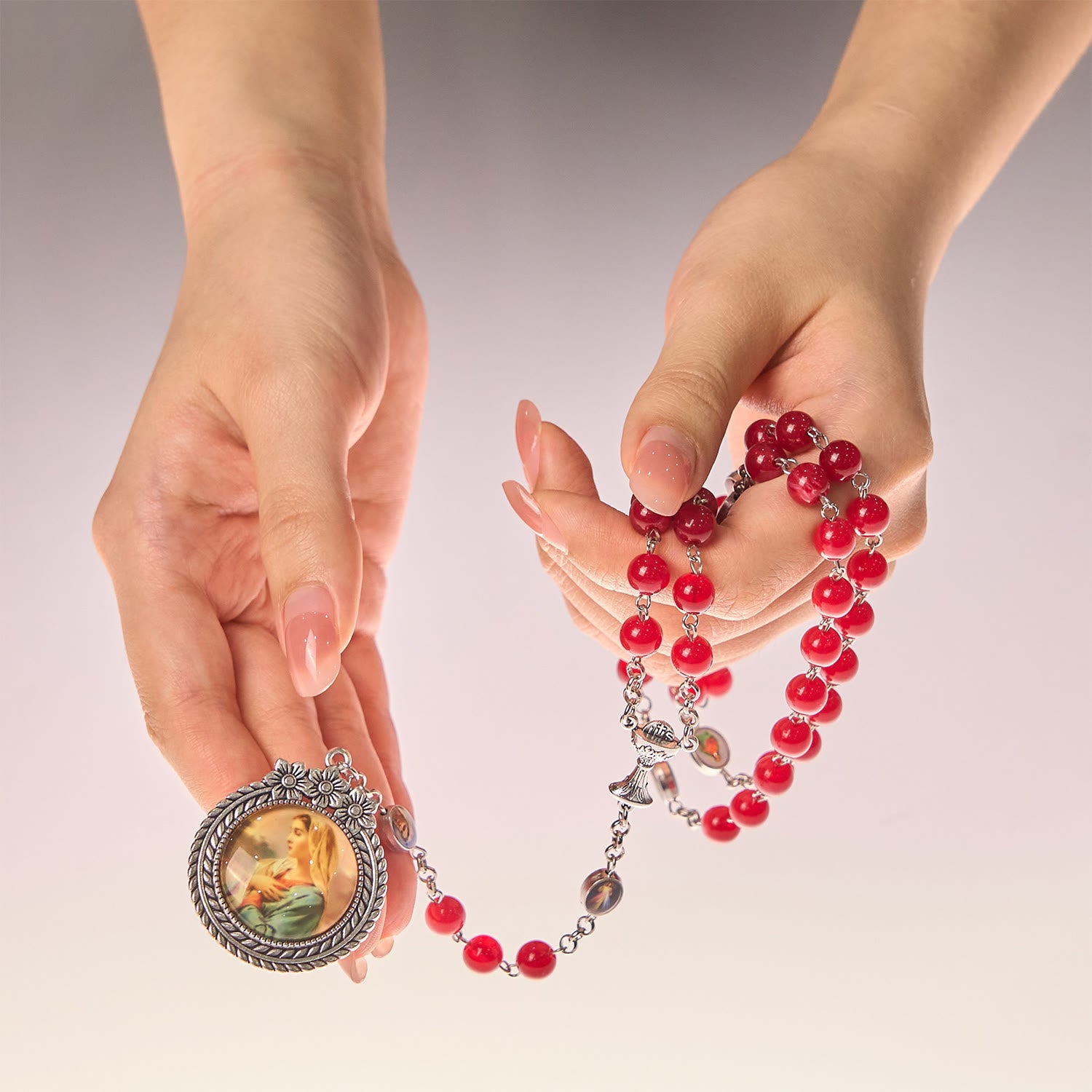 The rounded burgundy beads offer velvety warmth to the touch, catching light with subtle depth. Paired with the floral Our Lady medal and symbolic Holy Grail charm, its presence is both timeless and tender—crafted for moments of quiet reflection. -