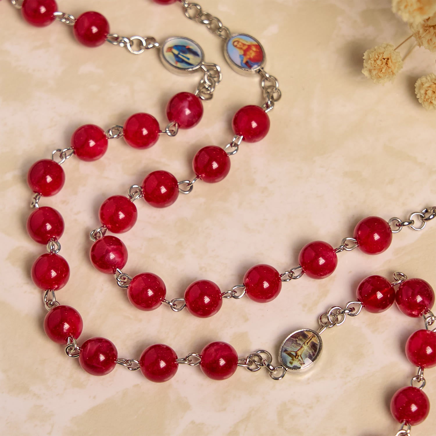 This rosary embodies deep devotion. Rich burgundy 8mm beads exude a mysterious luster, threaded upon a delicate chain. Centered by a finely flower-carved Our Lady medal and the Holy Grail emblem, it weaves reverence into every detail. -