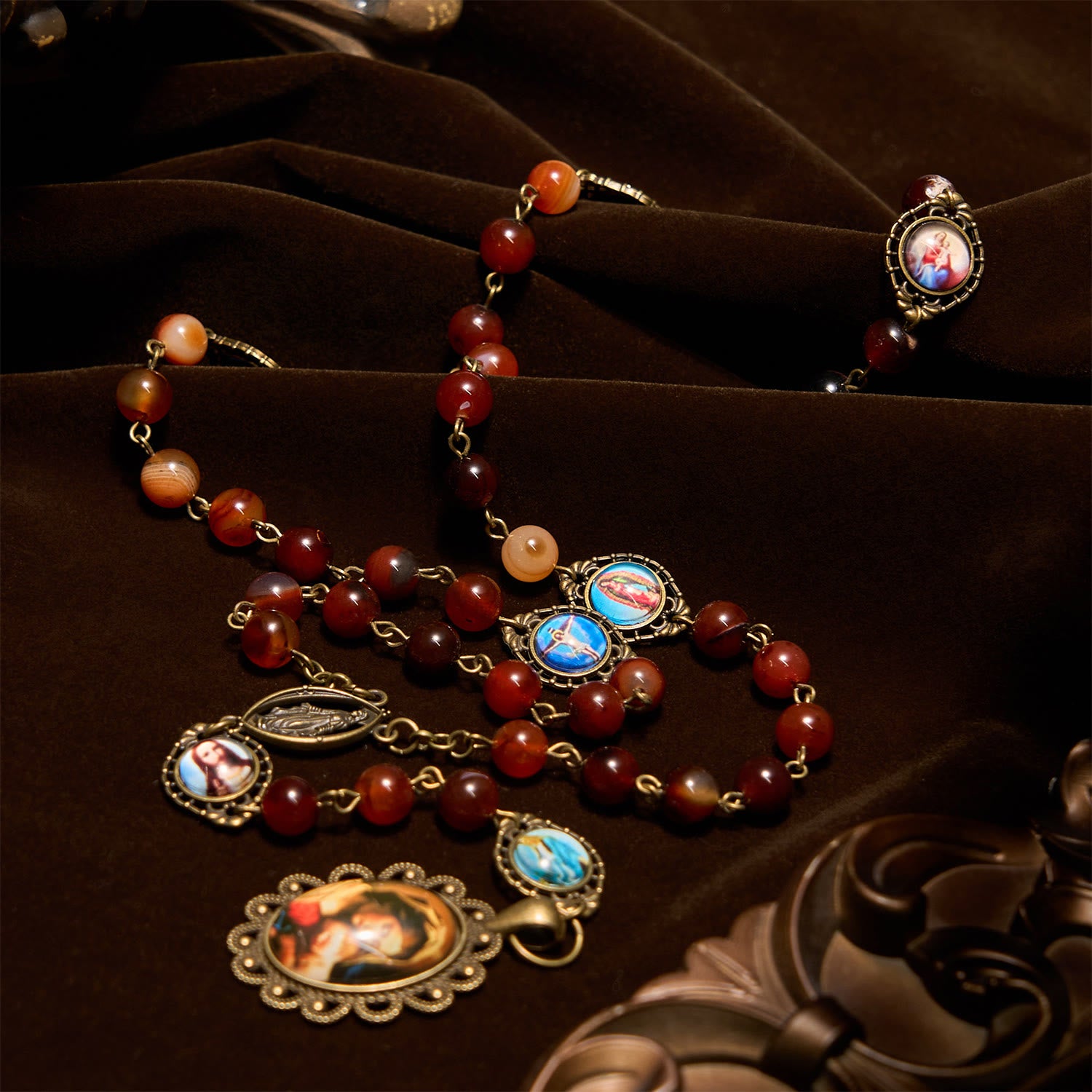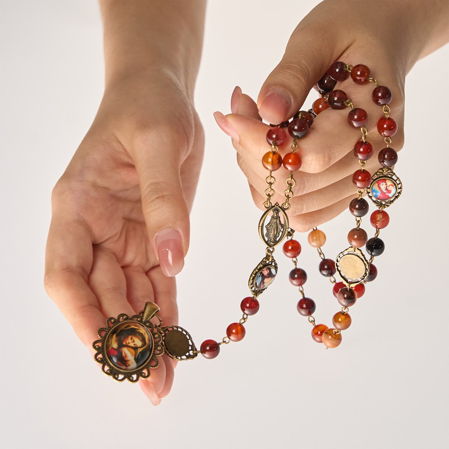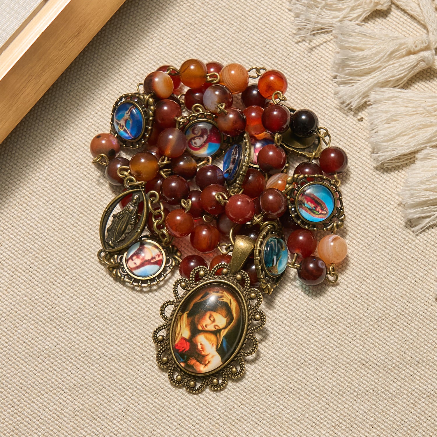 Madonna Medal & Saint Symbols of Dreamy Brown Agate Beads Rosary