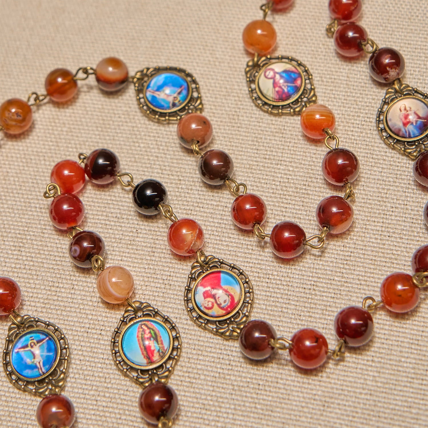 Misty brown agate beads carry nature’s soft whispers, flowing to a tender Madonna medal and circle of saintly charms—a dreamlike embrace of blessed devotion. -