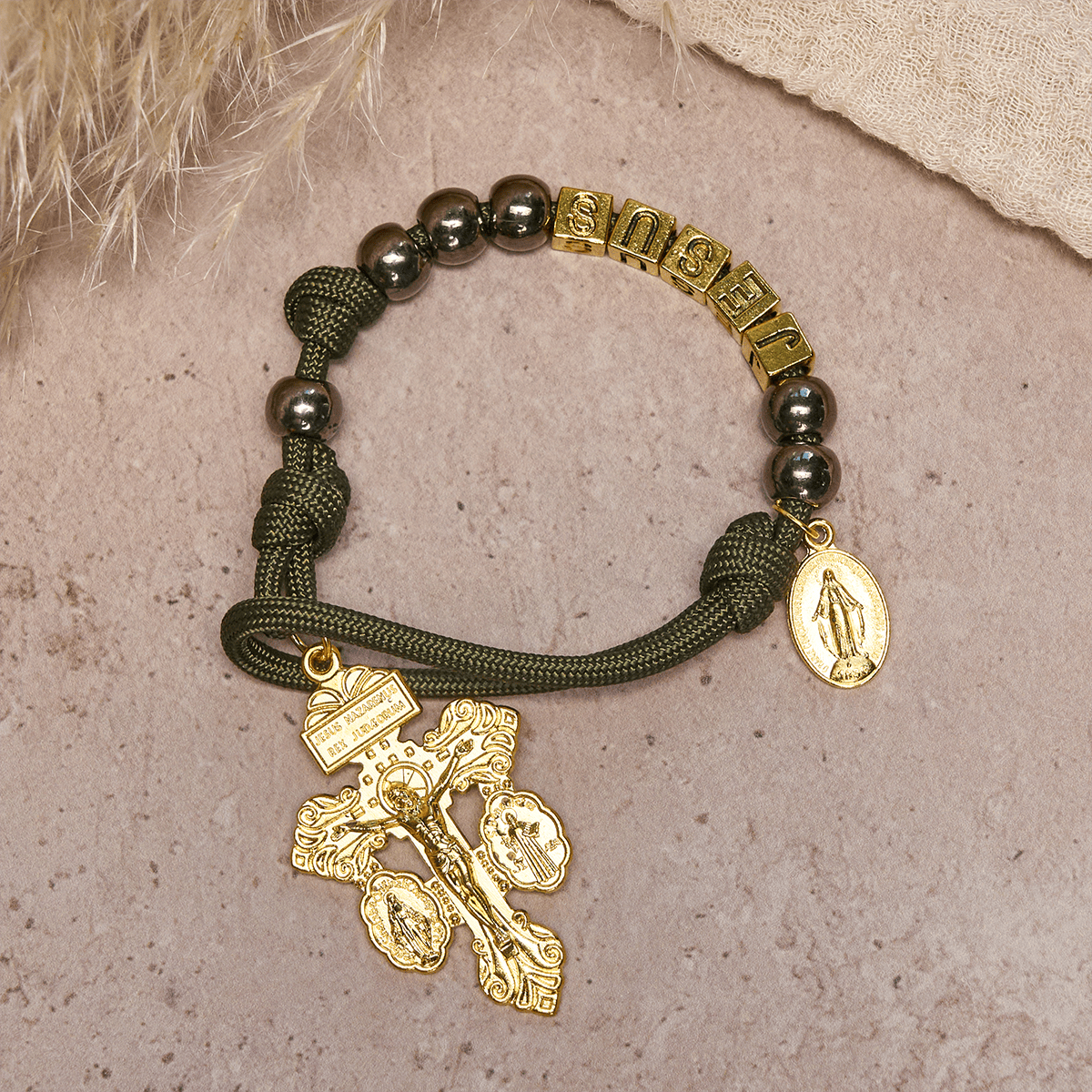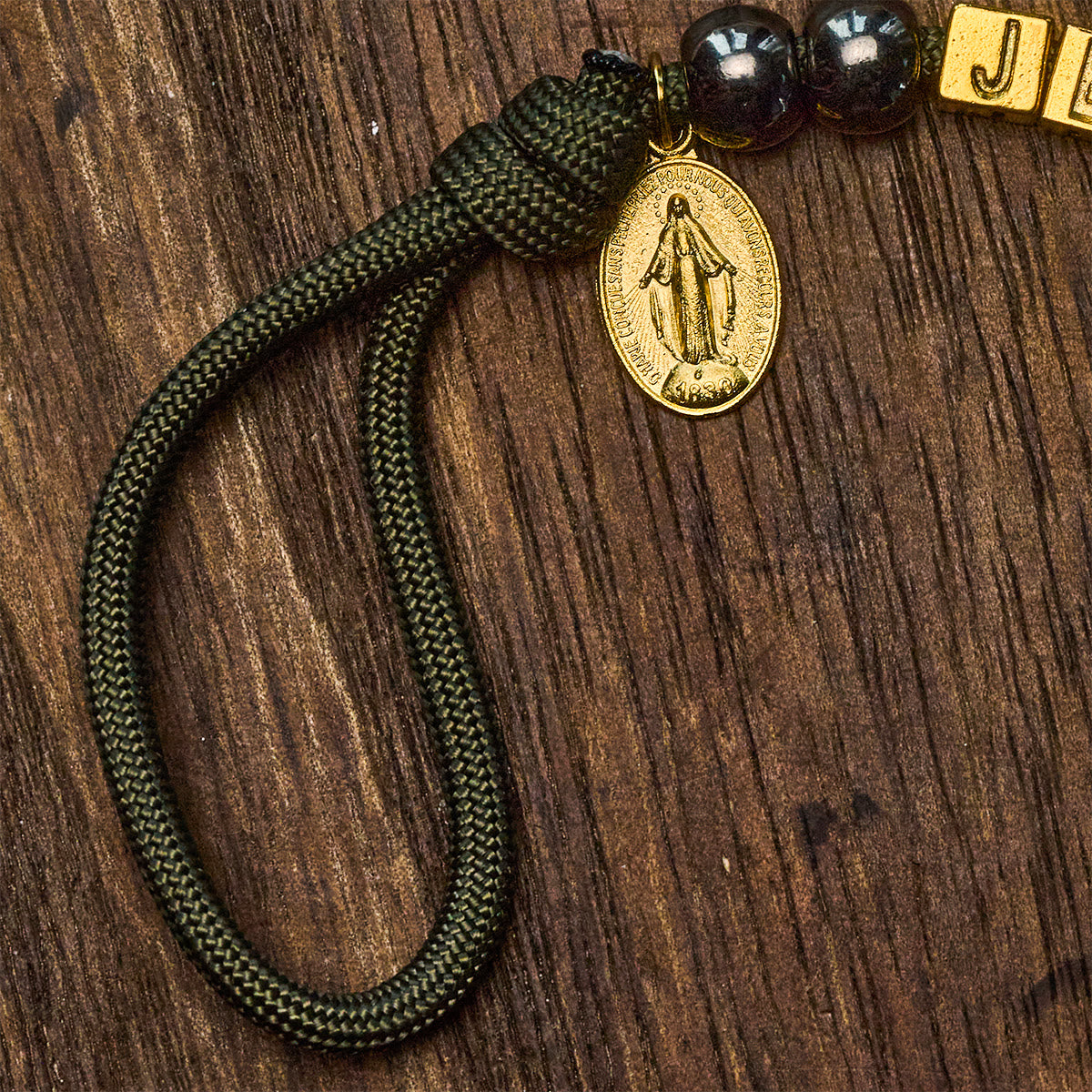 This compact cord pocket rosary pairs field-ready knots with hematite-style beads and bright gold accents. The JESUS letter cubes place the Holy Name exactly where you hold and pray. -