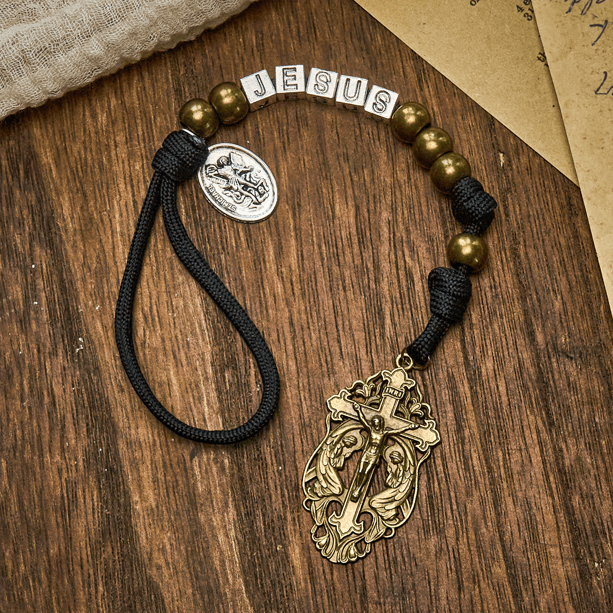 This compact pocket rosary pairs a black cord and warm metal tones with a bold JESUS letter strand, a St. Michael medal, and an ornate crucifix—simple to carry, powerful to pray. -