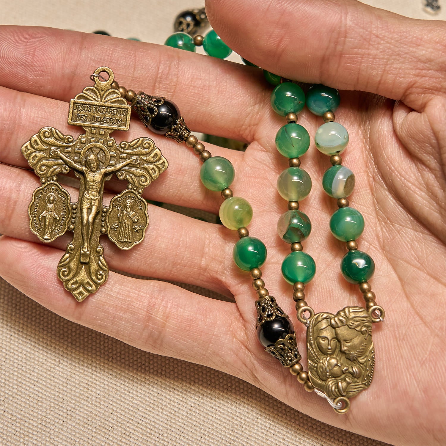 Exquisite Green Agate Rosary with Pardon Crucifix & Holy Family: Graceful Spiritual Narrative