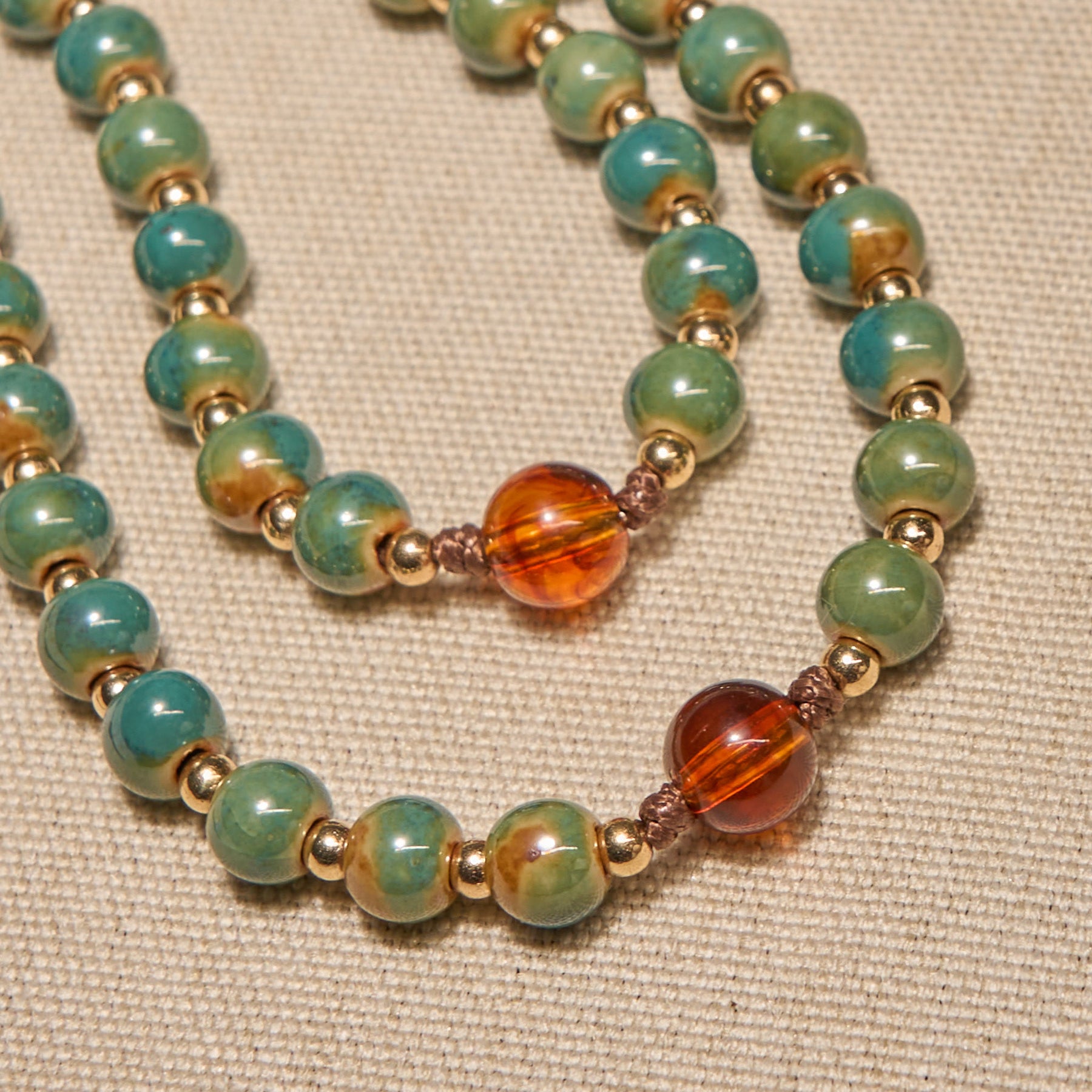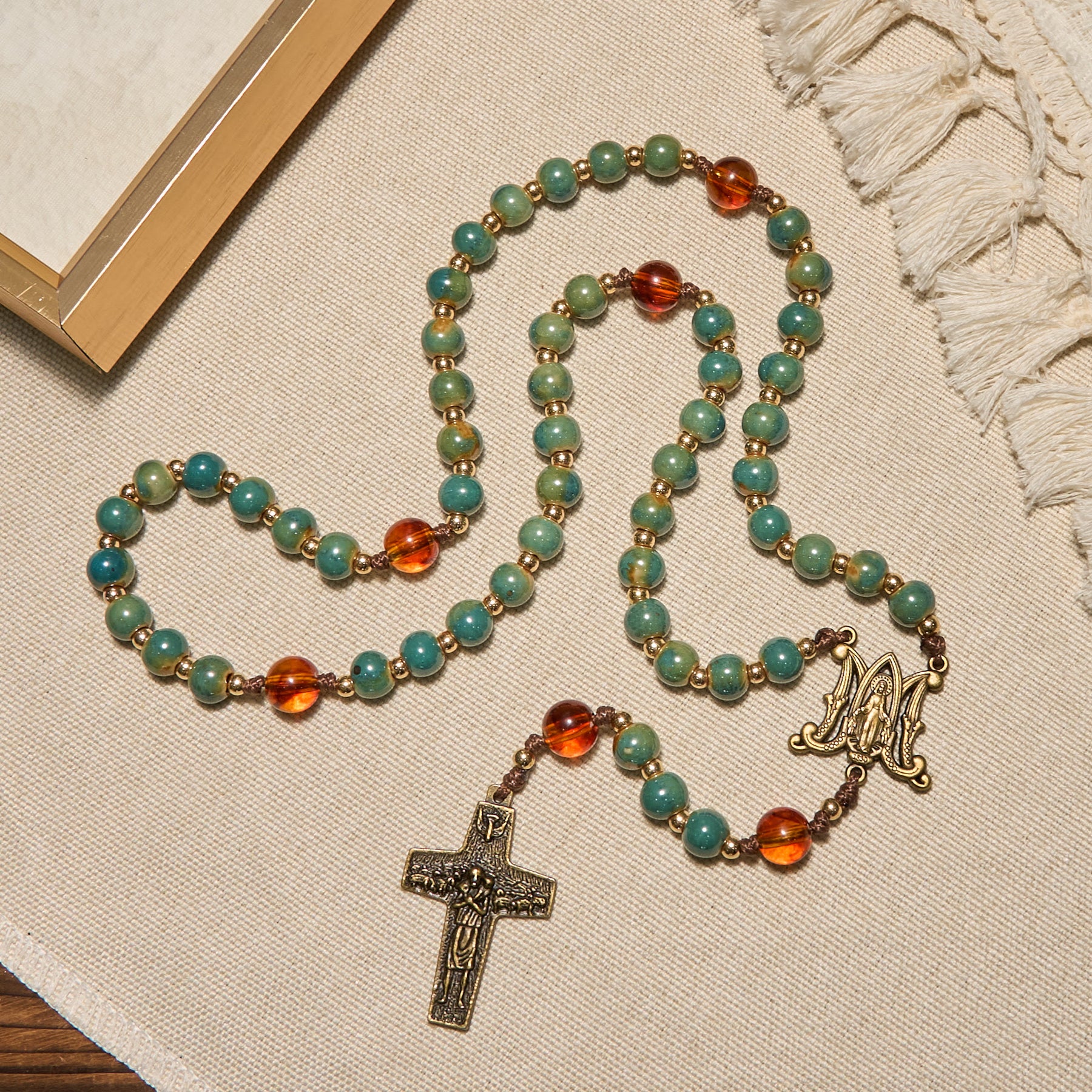 Handcrafted Green Ceramic Rosary with Miraculous Medal and Amber Beads: Feel Graceful Faith