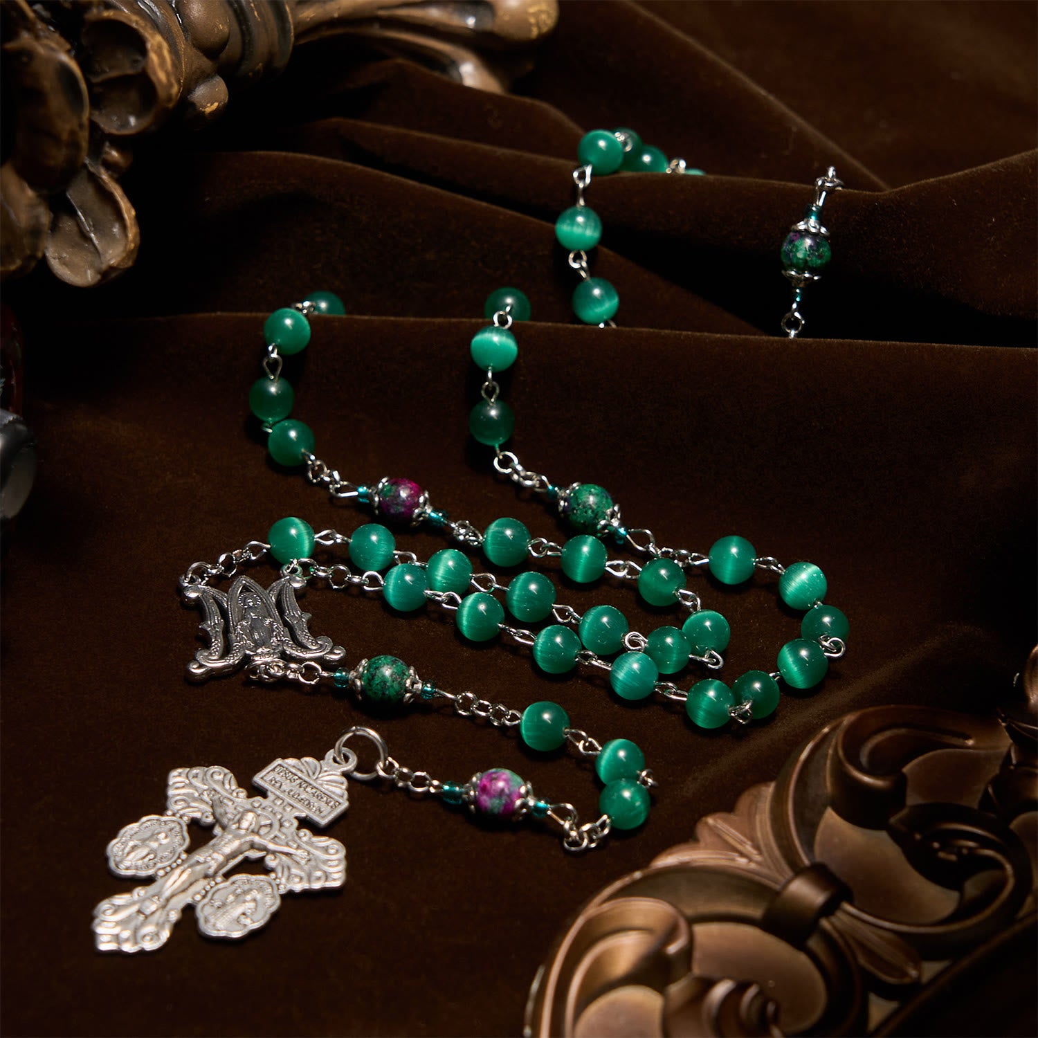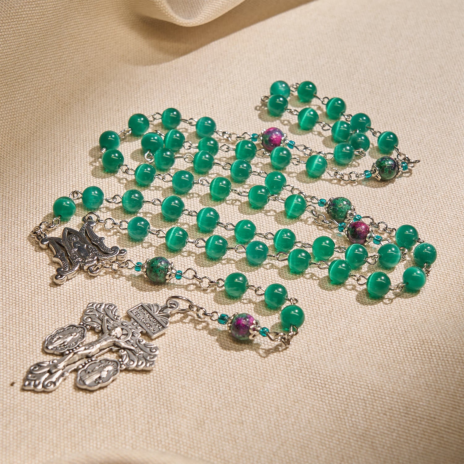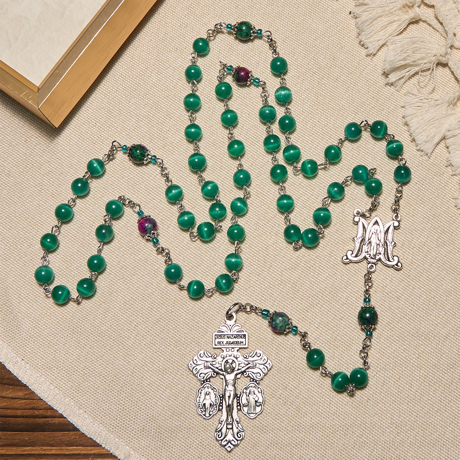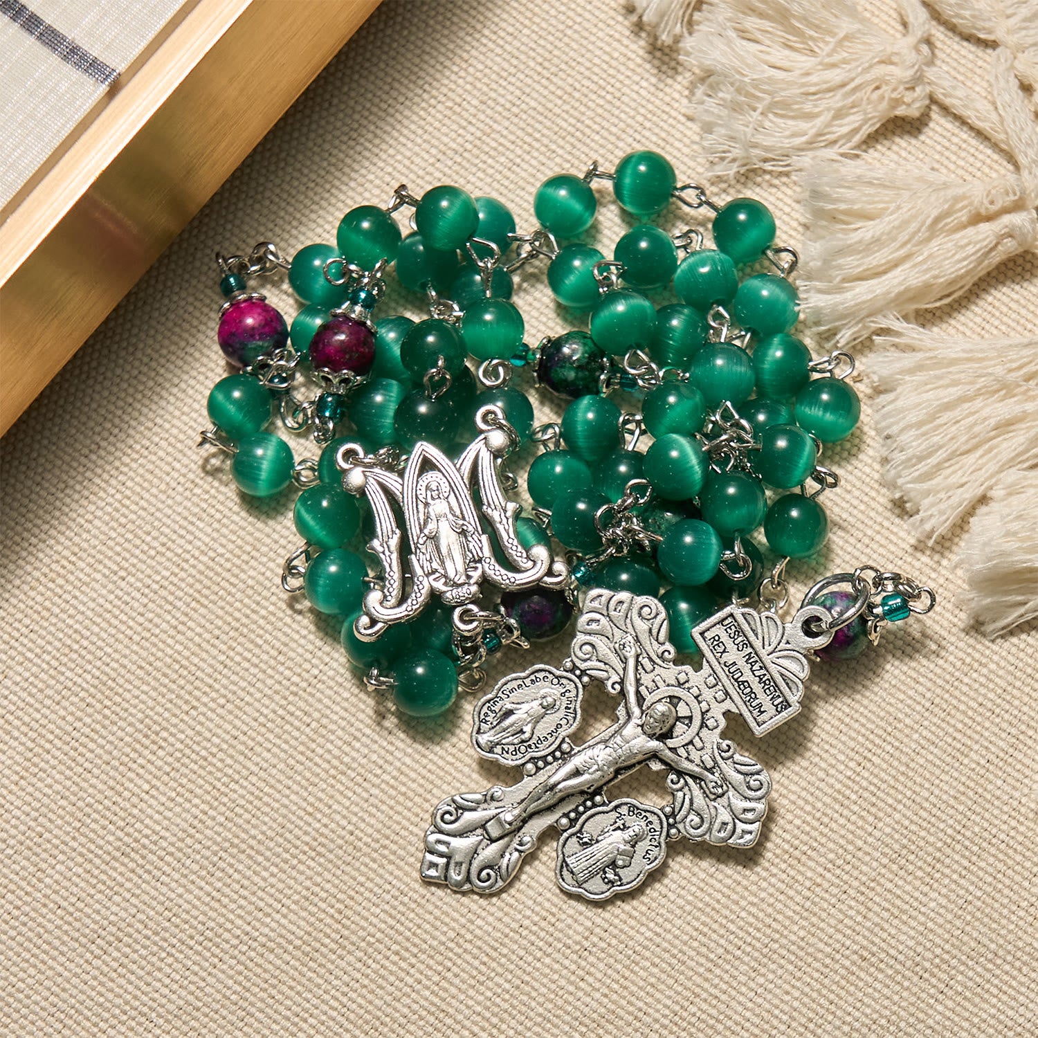 Natural Peacock Green Cat Eye Bead with Miraculous Medal & Crucifix Rosary
