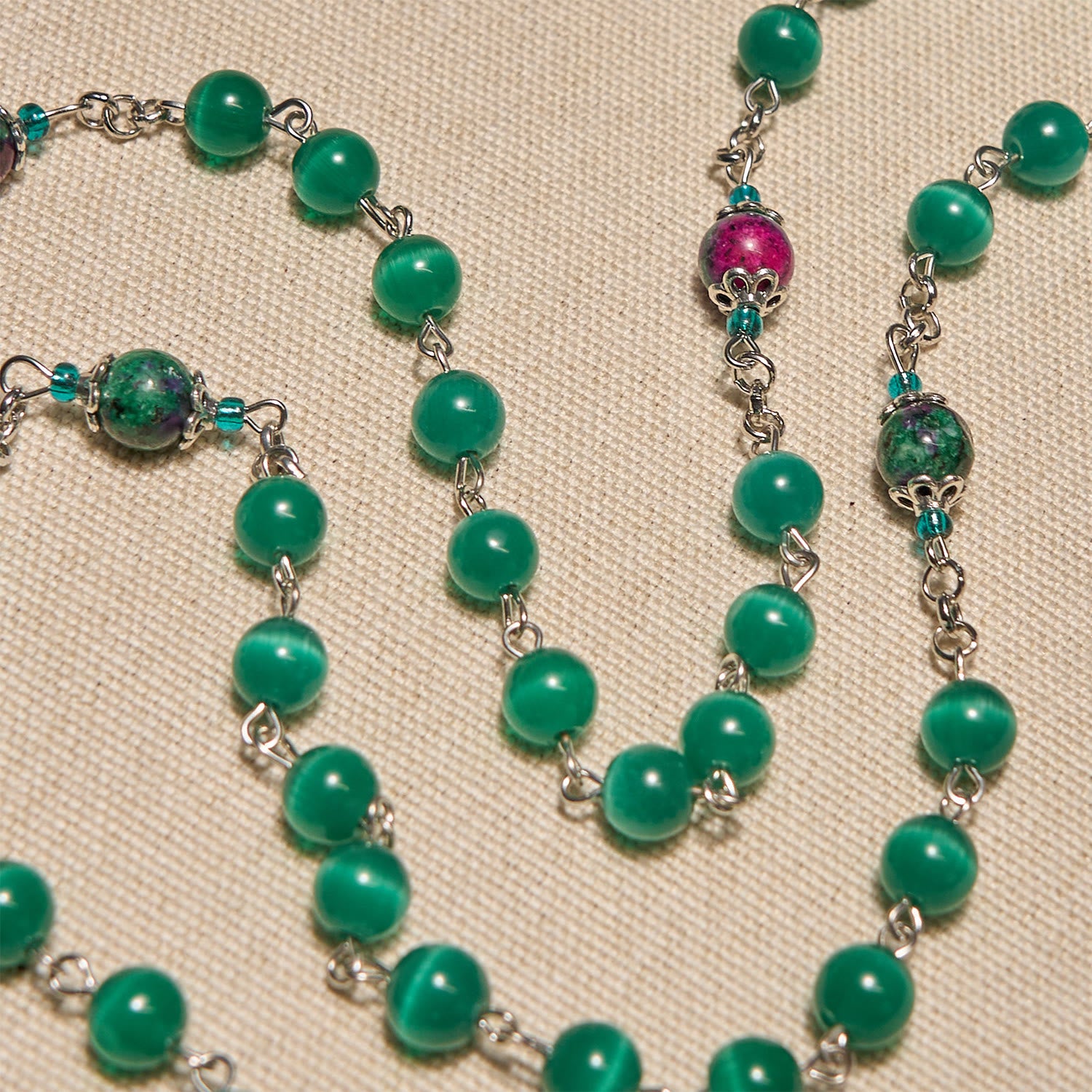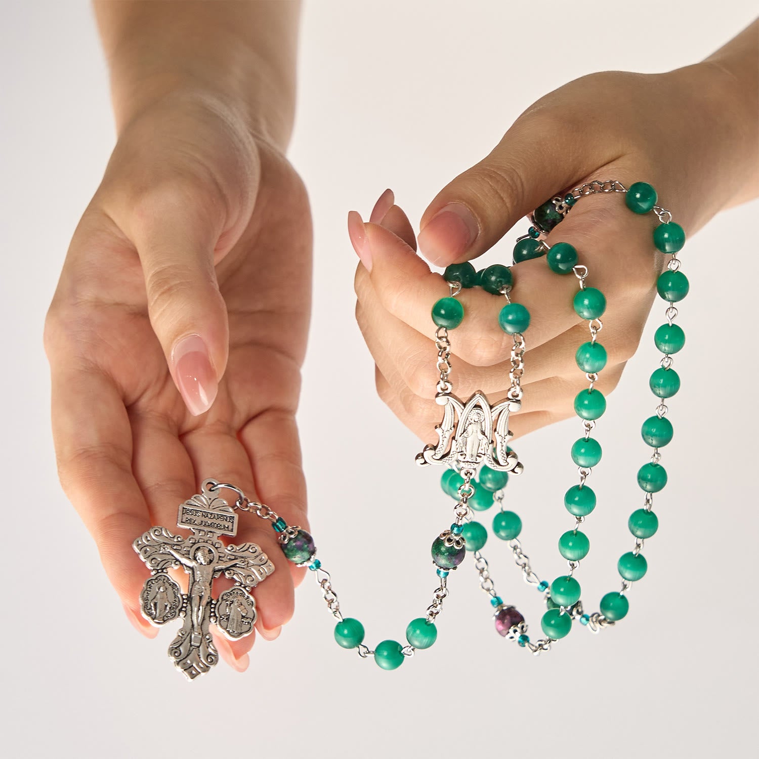 Peacock green cat eye beads shimmer with shifting depth, flowing to a gleaming Miraculous Medal and crucifix—each prayer wrapped in forgiveness and sacred calm. -