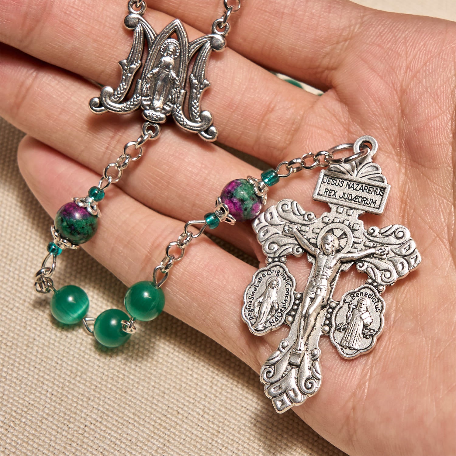 Worn daily, the jewel-toned green and sacred symbols infuse moments with quiet strength—faith as luminous as it is grounding. -