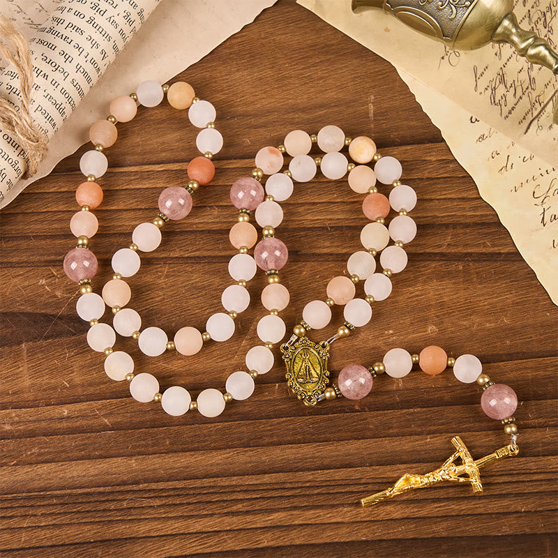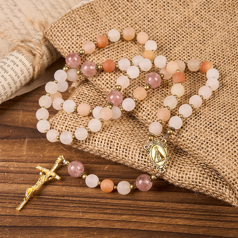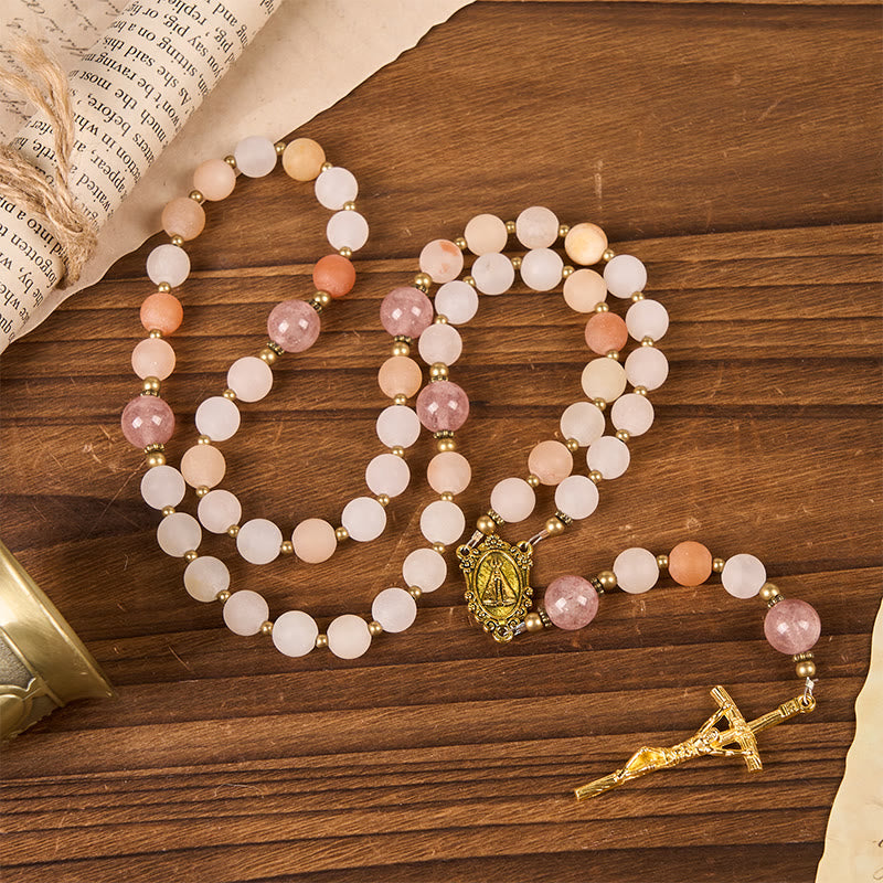 Our Lady & Crucifix of 8mm Pink Aventurine & Strawberry Quartz Rosary