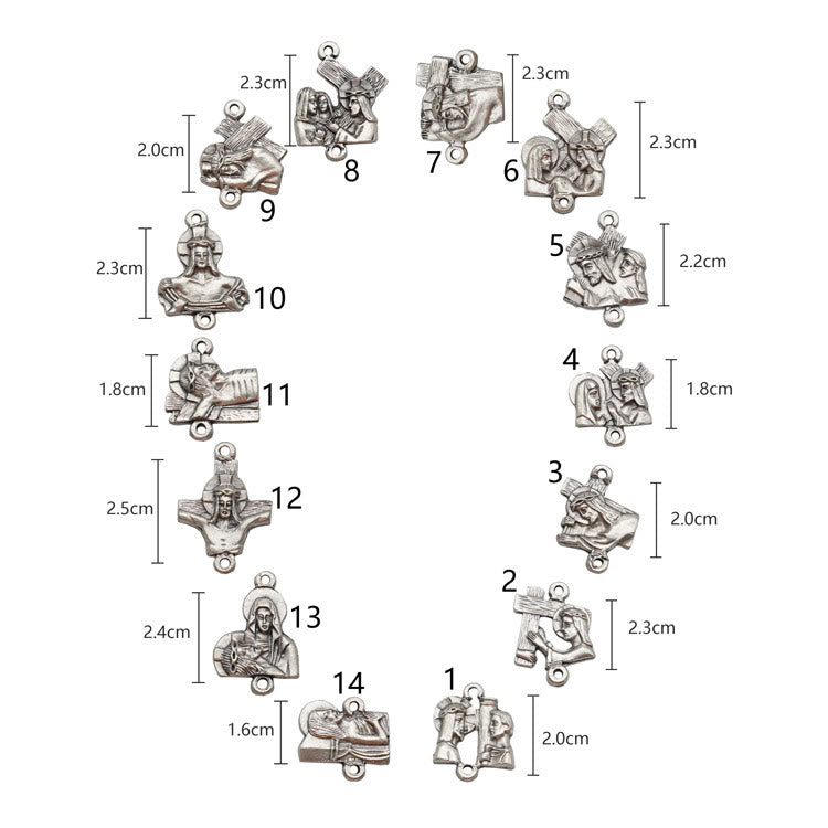 Stations of The Cross Medals: Adorning the rosary are exquisitely detailed medals that represent the 14 Stations of The Cross. Each station invites profound contemplation, guiding you through the sacrificial journey of Christ with each touch.
