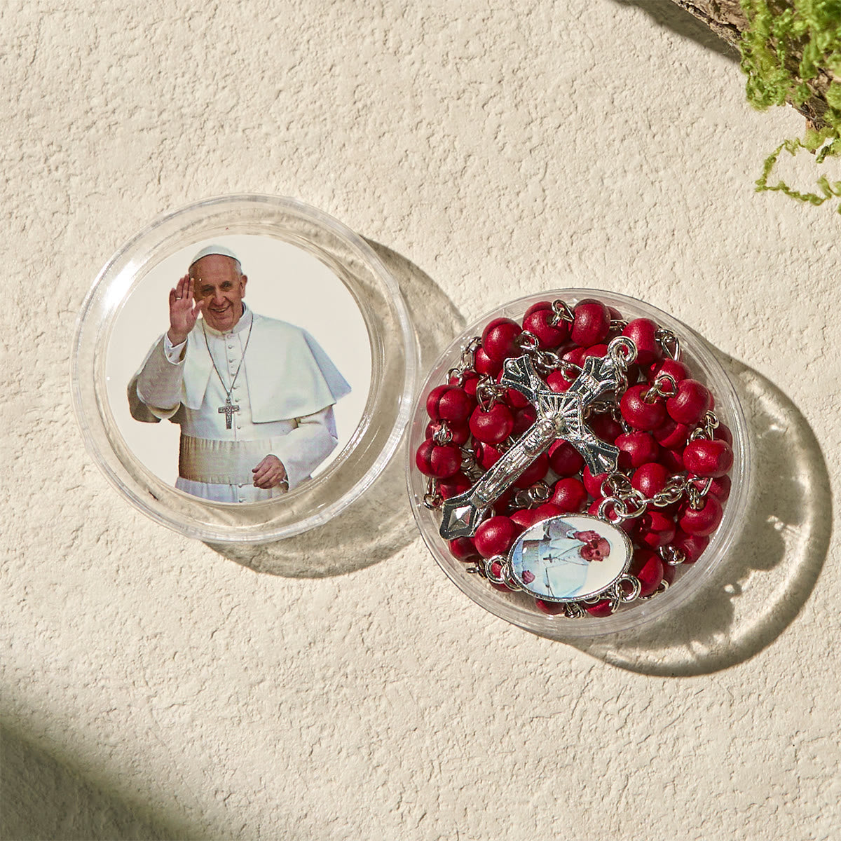 Divine Wooden Rosary in Red and White with Pope Francis Blessing Case