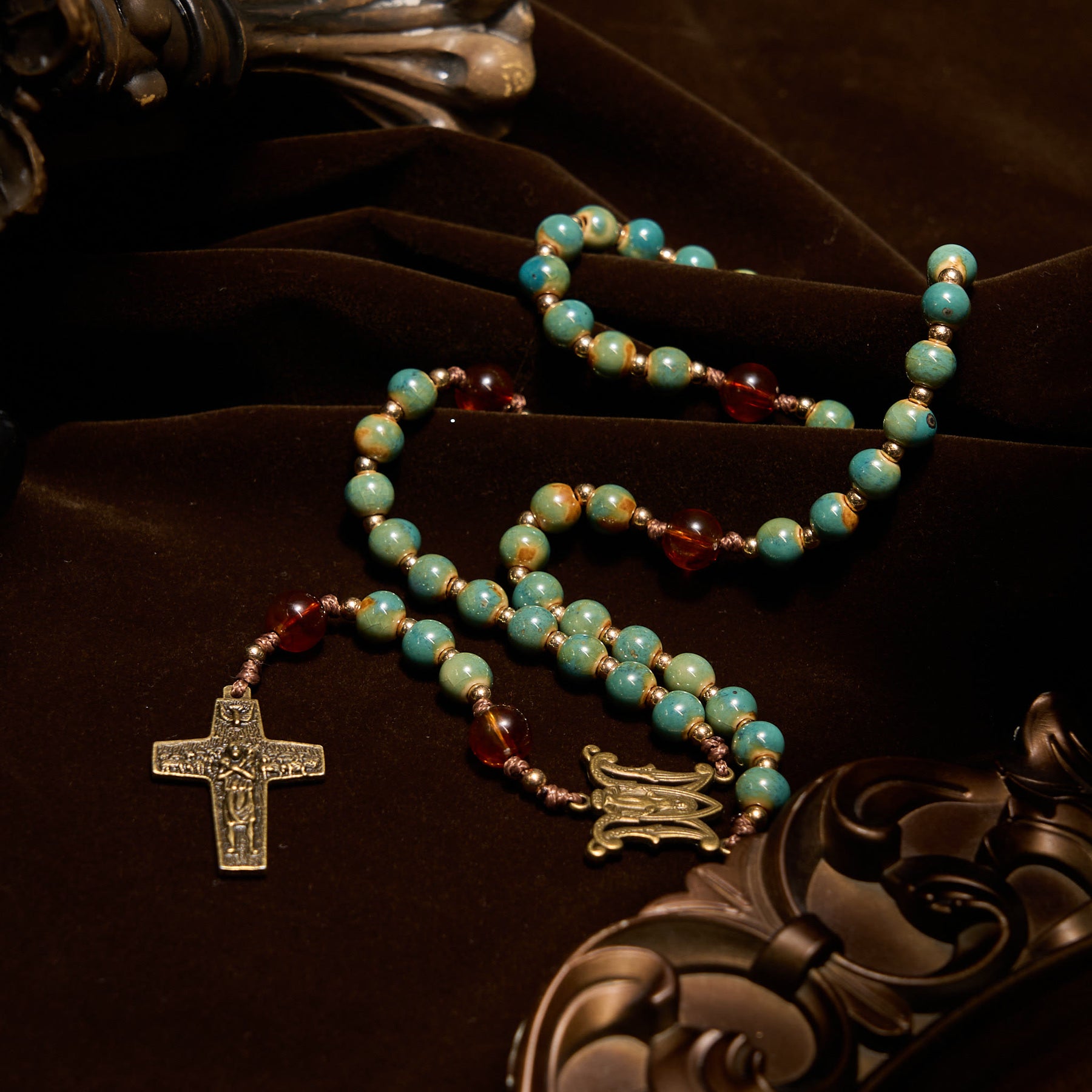 This rosary blends turquoise beads’ natural serenity with golden alloy links. The Miraculous Medal and crucifix, rich in detail, echo divine grace—each bead a bridge to sacred connection. -