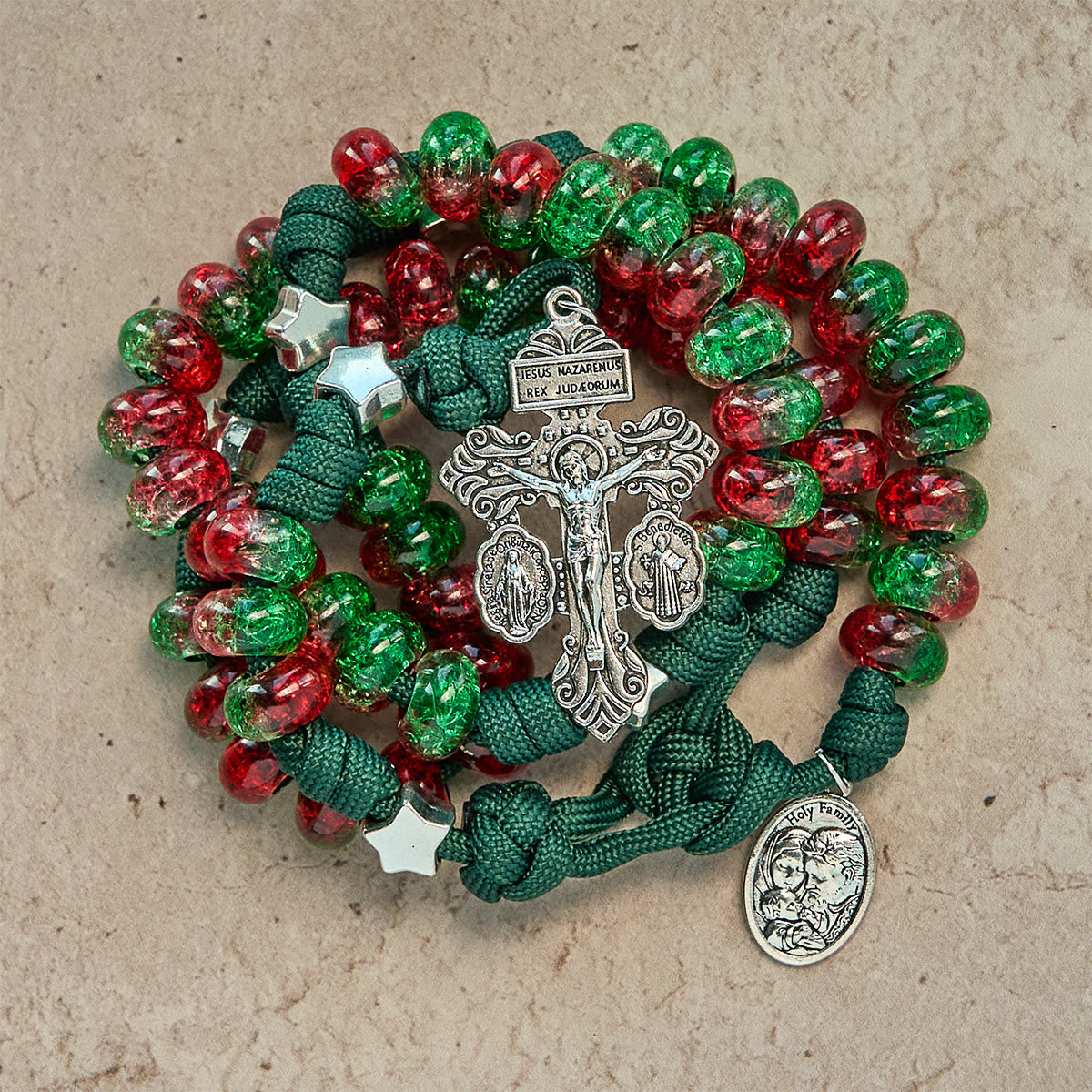 Red recalls redeeming love; green proclaims evergreen life. The star beads echo Bethlehem’s light, guiding every decade toward Christ. The crucifix anchors hope in His saving cross. -
