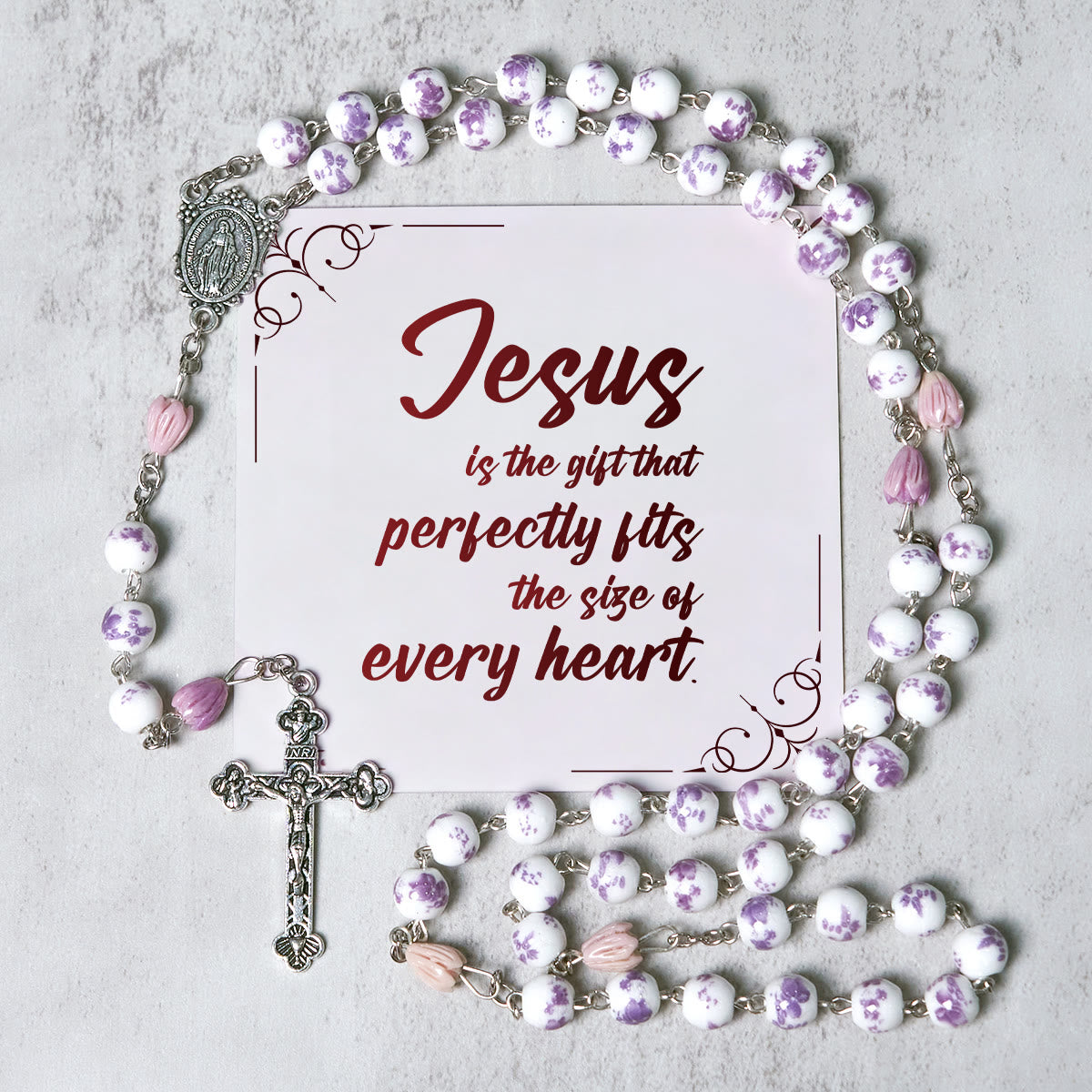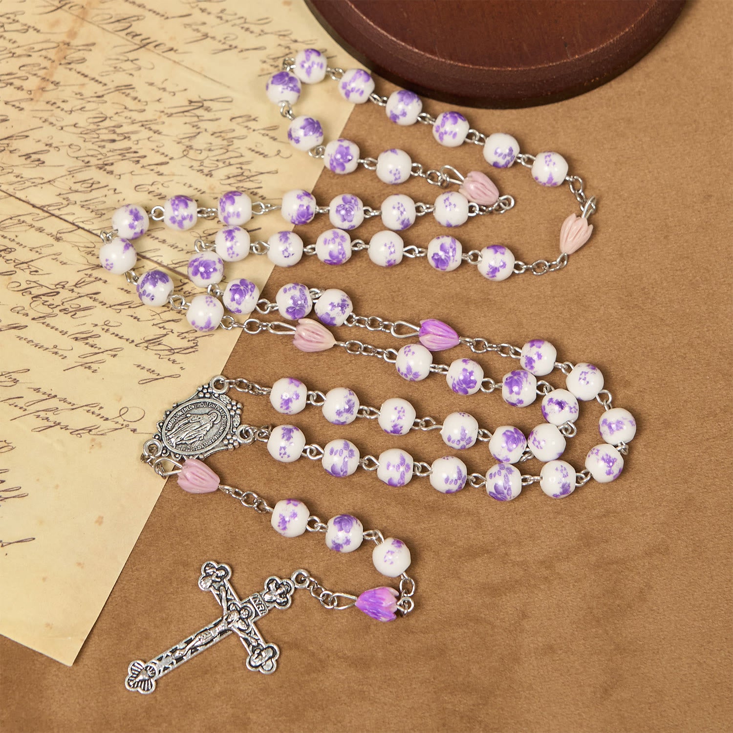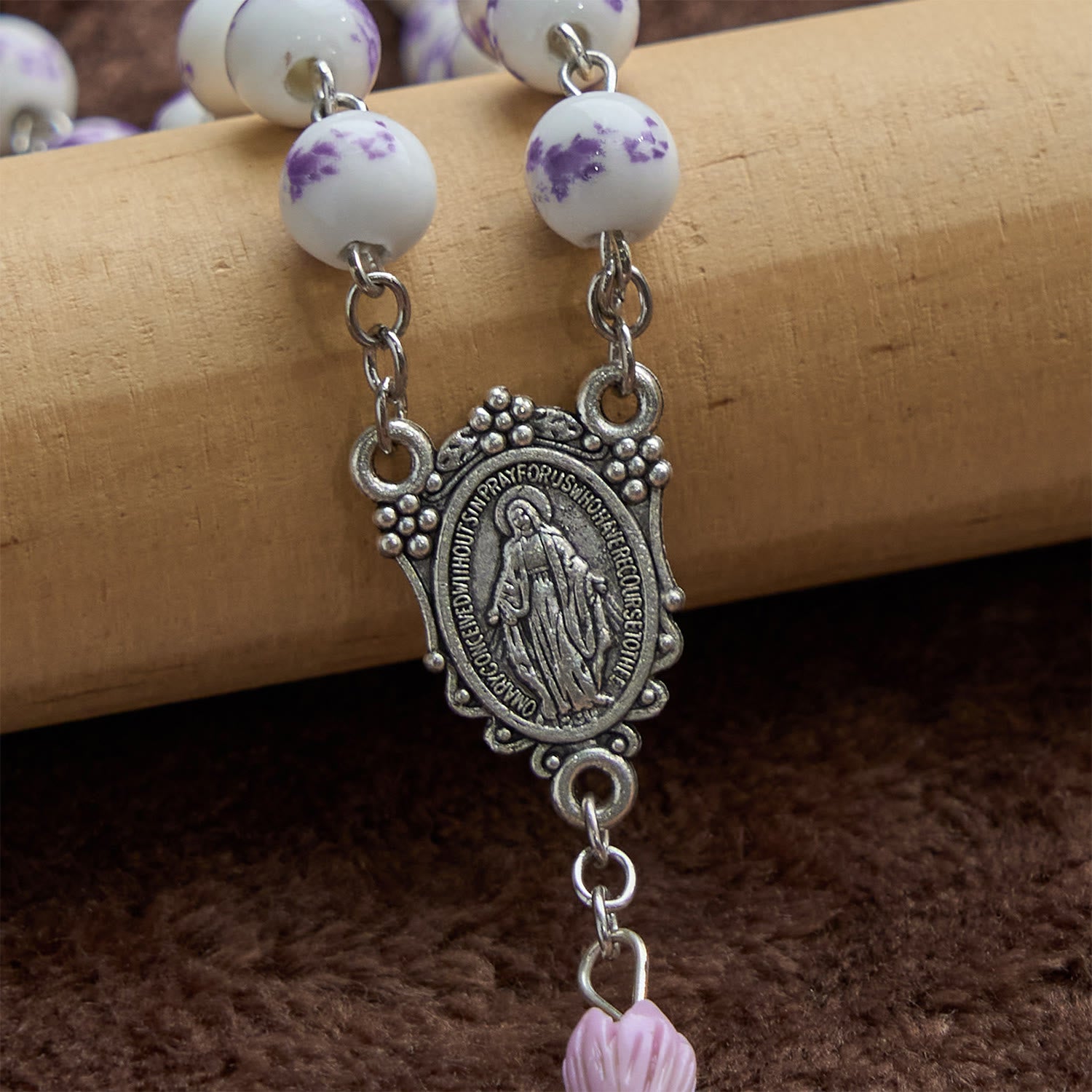 The rosary showcases ceramic beads, each adorned with intricate purple floral patterns. As you glide your fingers over these smooth beads during prayer, their tactile allure offers a soothing and immersive experience. The ceramic material, with its delicate artistry, adds an air of elegance and timelessness to your act of worship.