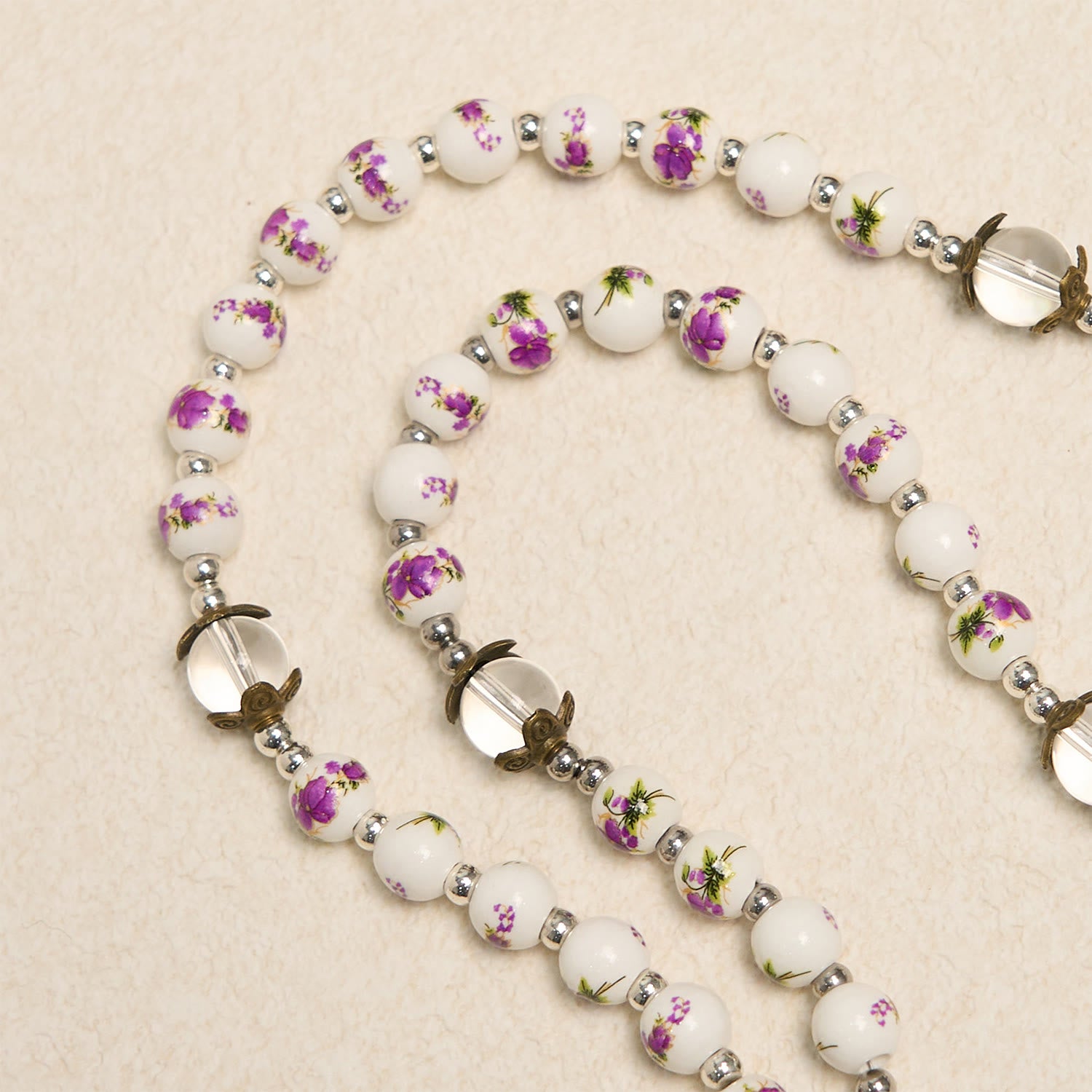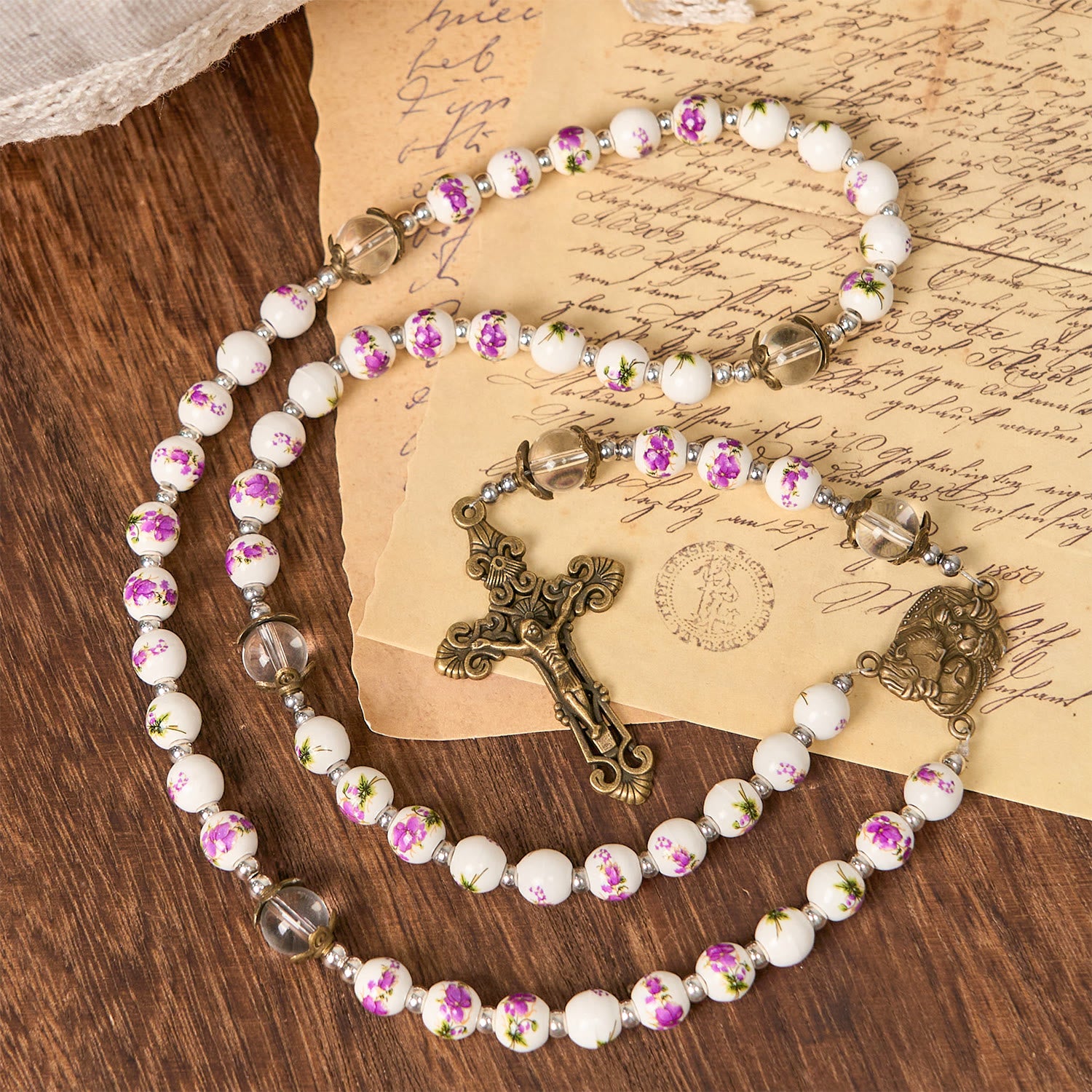 The rosary's beads are a sight to behold. Pristine white in color, they're delicately hand - painted with purple floral patterns, a harmonious blend of nature's beauty and divine artistry. Interspersed among them are clear, shimmering beads that catch the light, adding a touch of celestial sparkle. The ornate crucifix, a central feature, is intricately crafted to depict the sacrifice of Jesus Christ, a poignant reminder of His love and redemption. The antique - finish metal accents throughout lend an air of timeless reverence. -