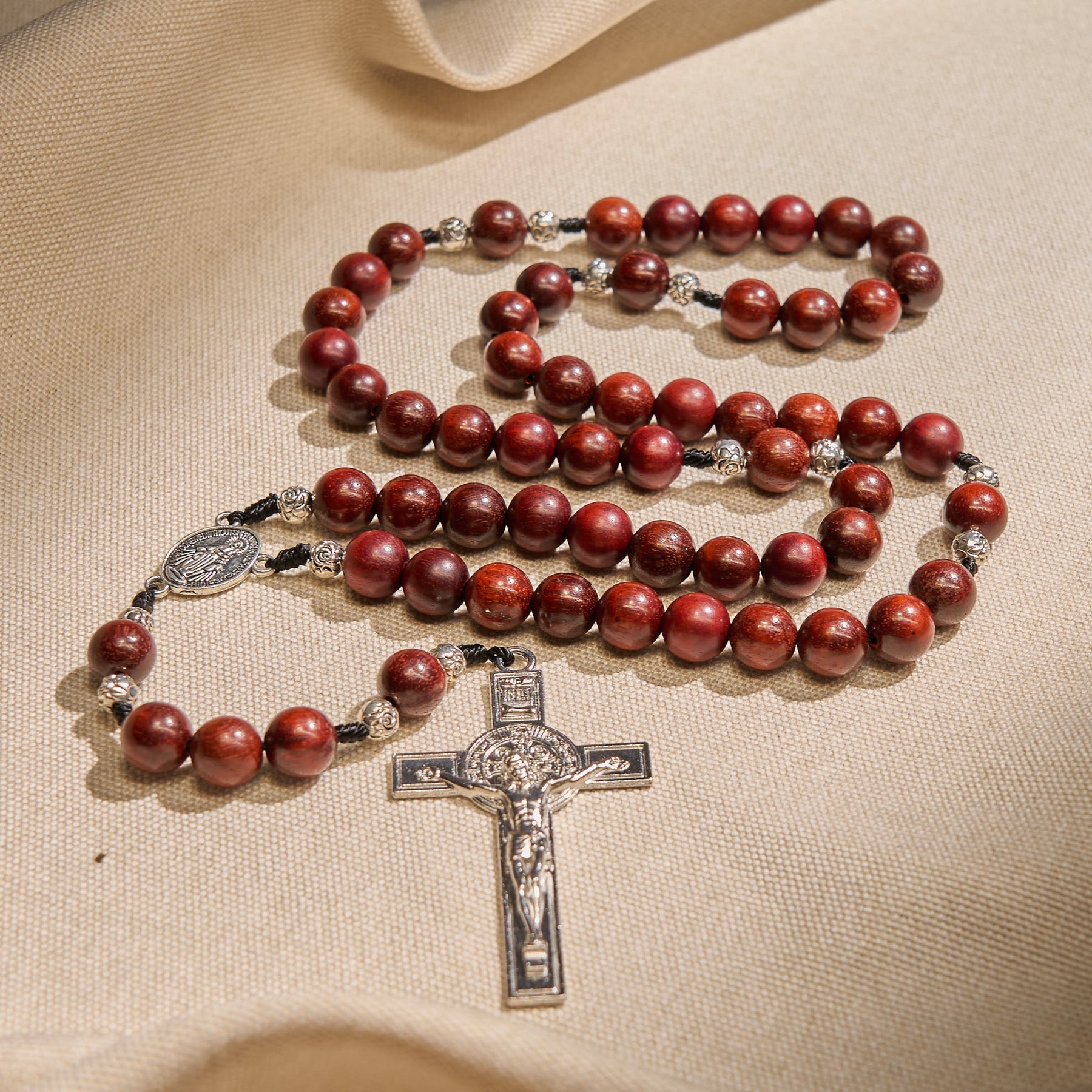 This rosary fuses red wood and rose beads with sacred metalwork. Each bead holds earthy strength, the Miraculous Medal and crucifix echoing divine grace—connecting wearers to sacred protection. -
