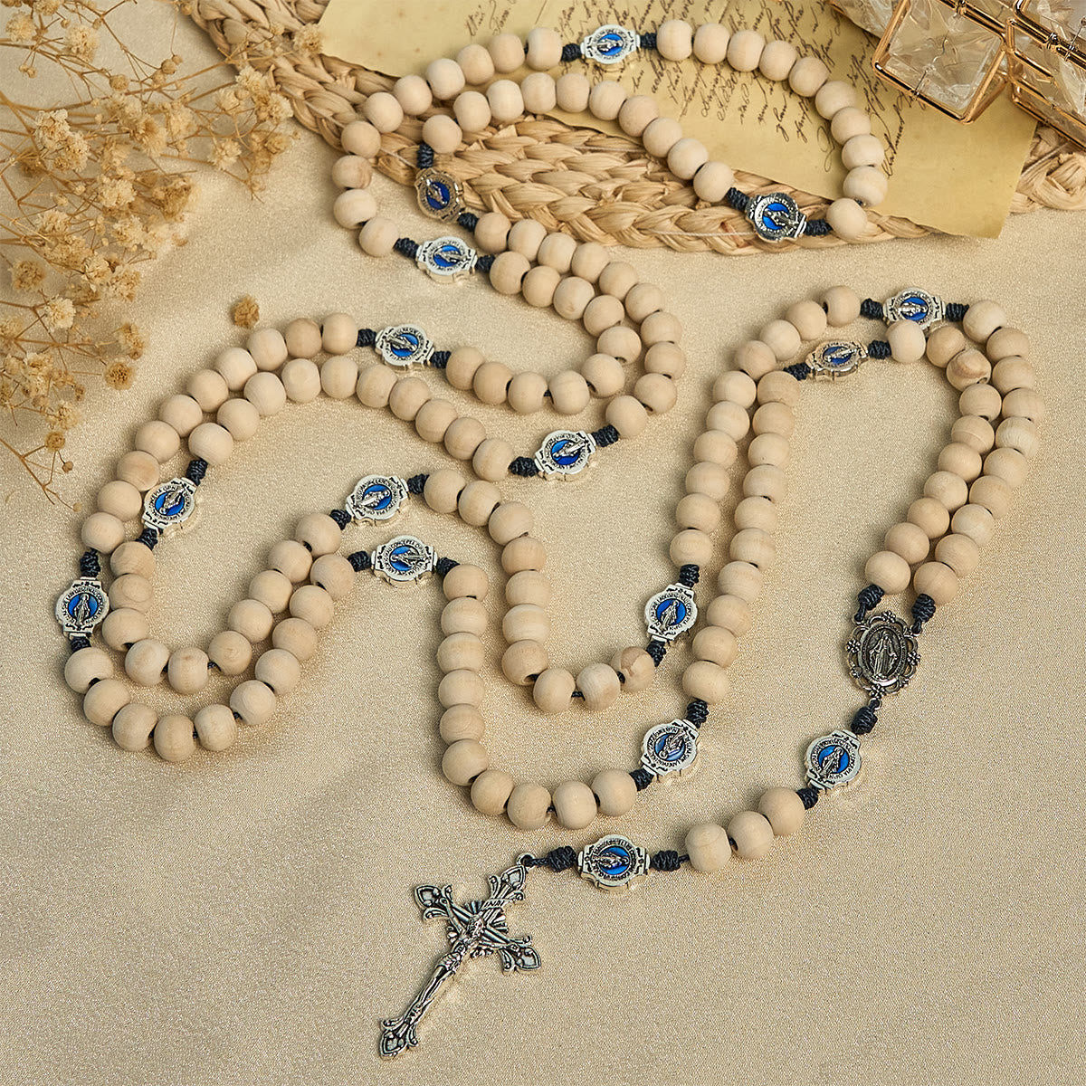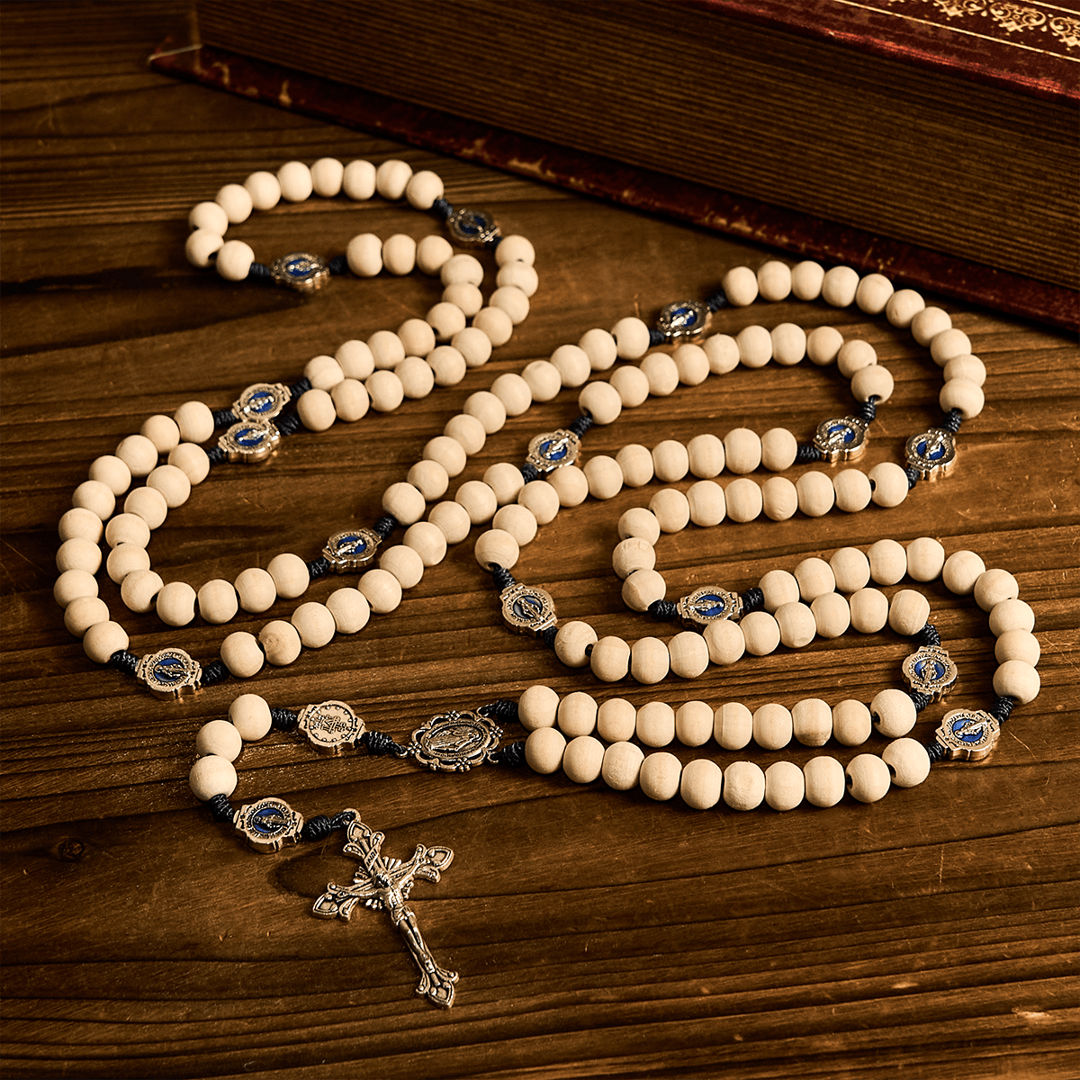Crafted with smooth ivory-toned beads, the rosary radiates purity, humility, and timeless elegance. The blue Miraculous Medal accents interwoven throughout bring the presence of the Blessed Virgin Mary. -