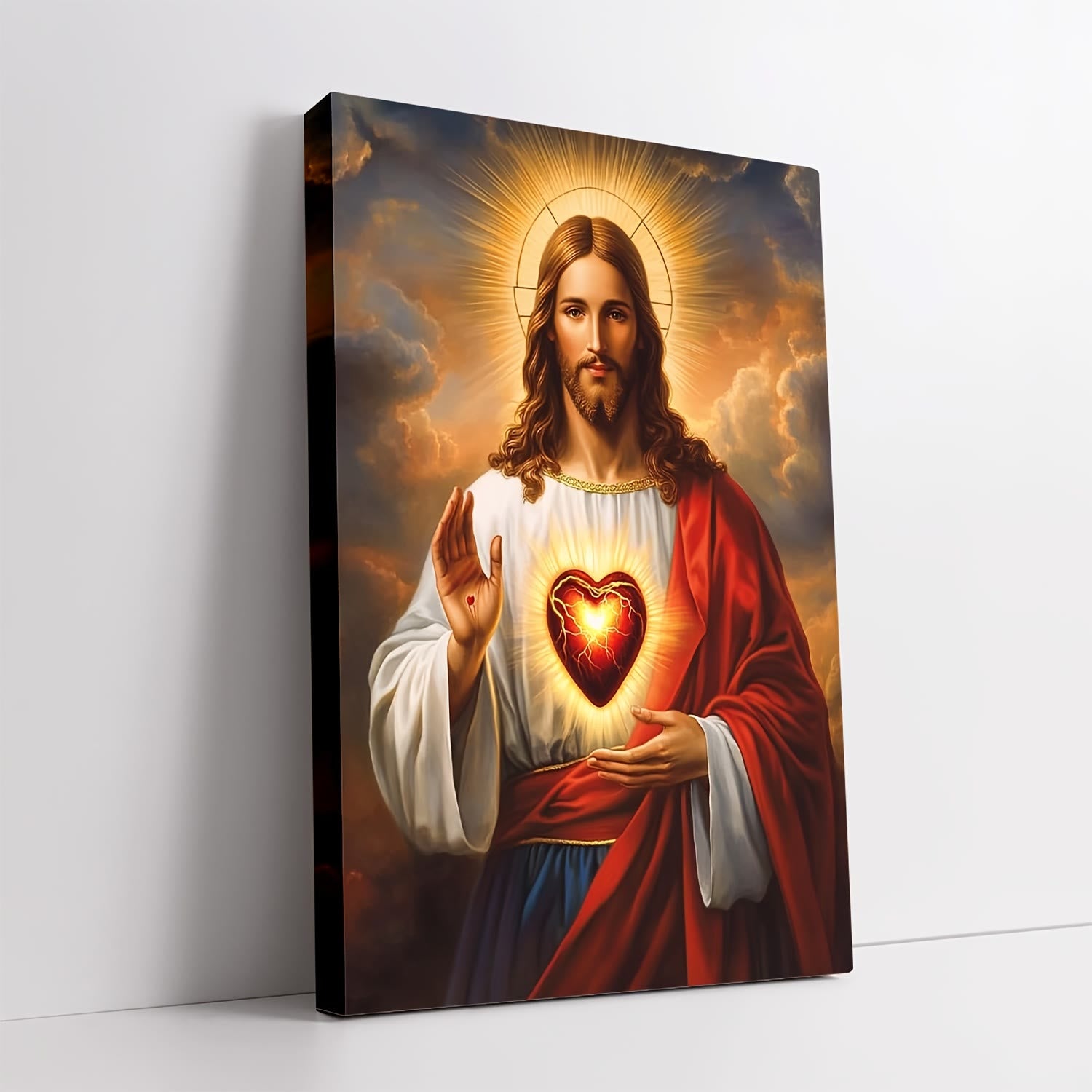Featuring the Sacred Heart of Jesus with a radiant halo and loving gesture, this art print radiates divine love and spiritual devotion — inviting reflection on Christ’s boundless compassion. -