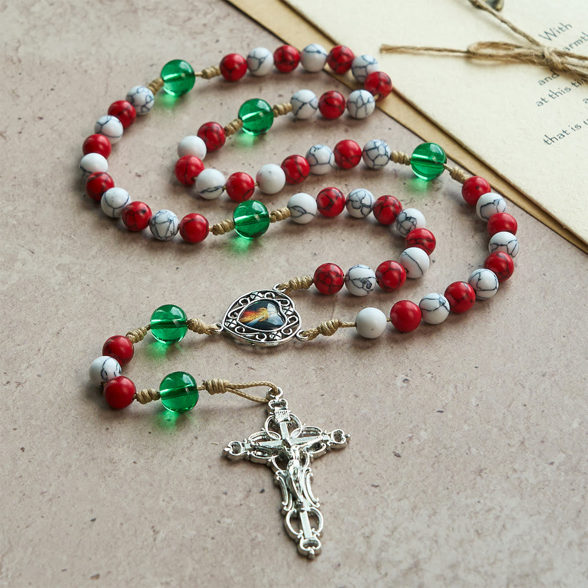 This Christmas rosary strings bright red, marble-white, and evergreen beads around a baroque crucifix and a heart-framed center—one side Divine Mercy, the other Our Lady—uniting festive cheer with the mystery of Christ’s birth. -