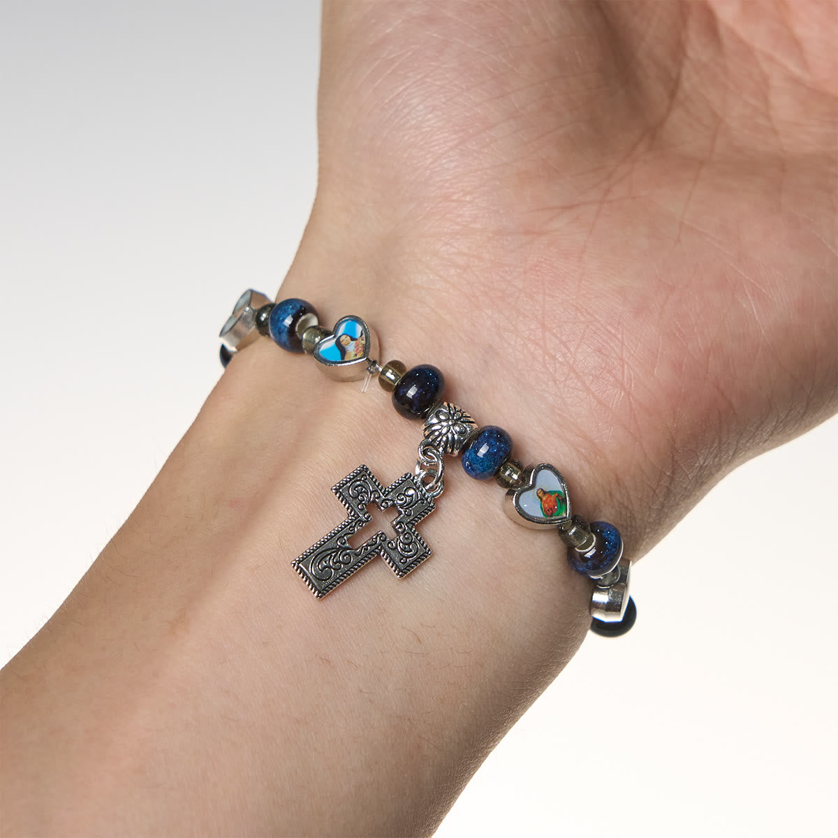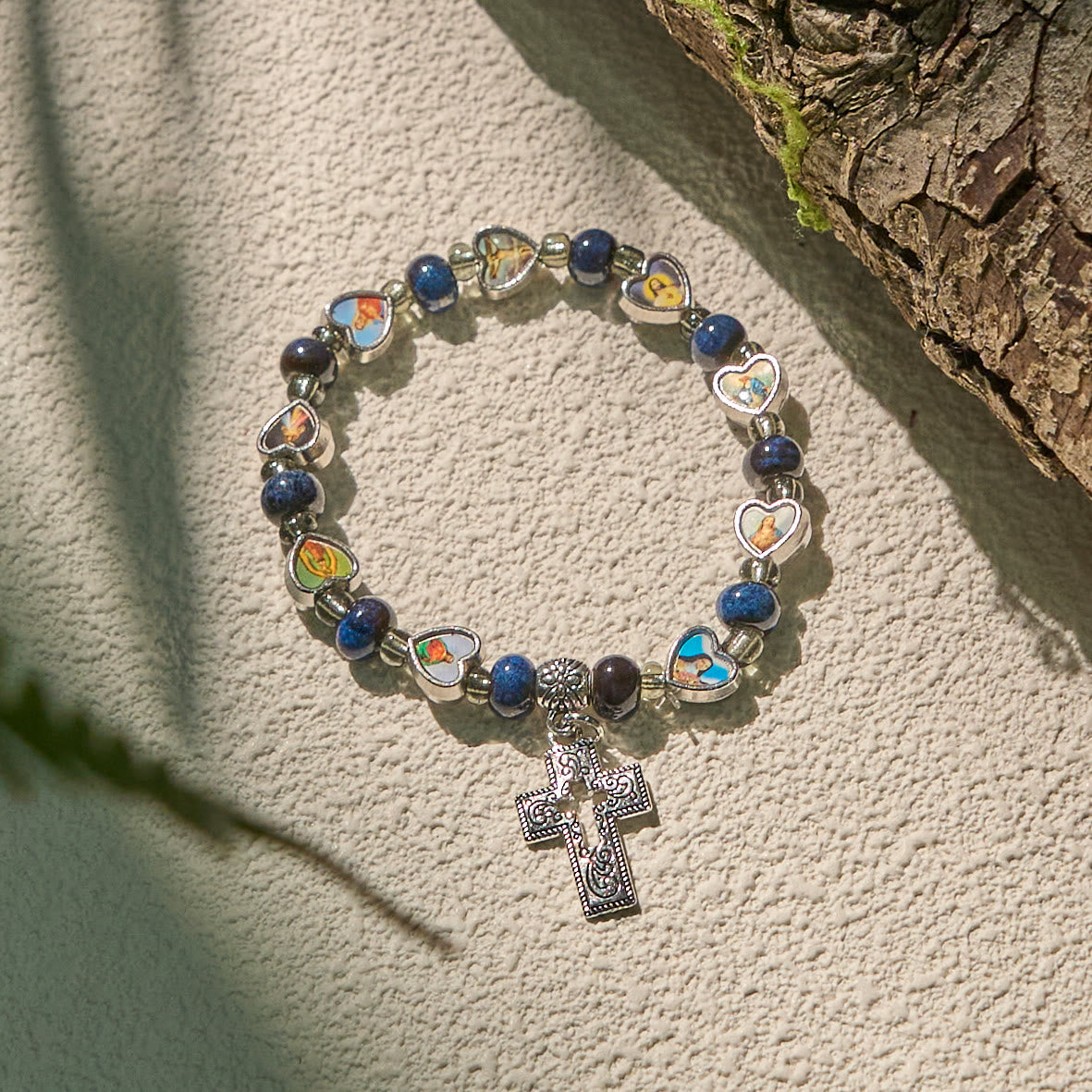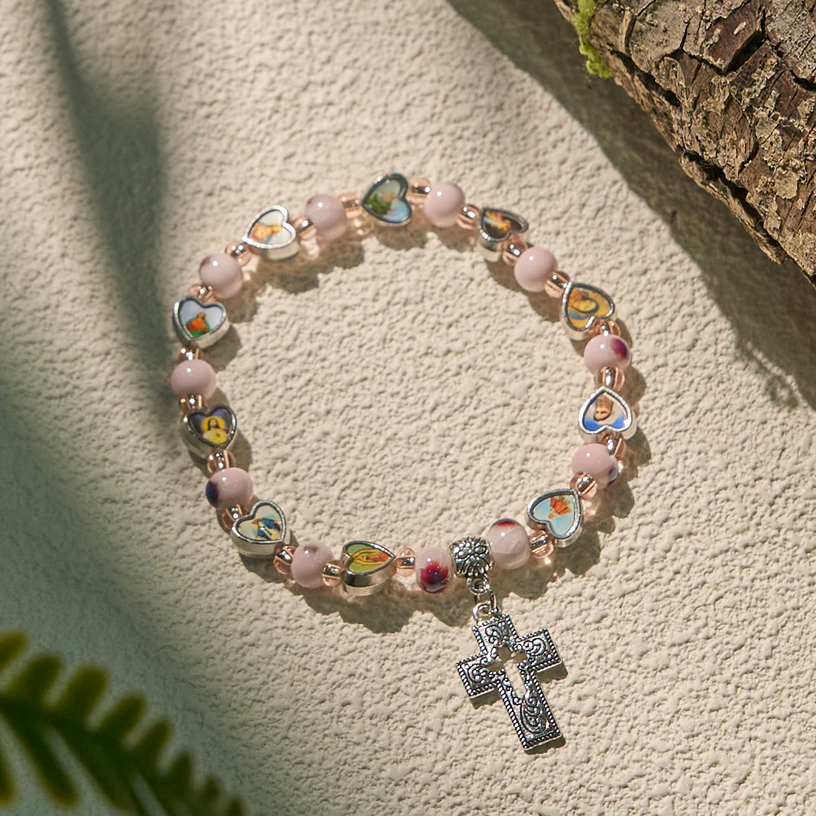 The cross symbolizes Christ’s sacrifice and guidance, while the heart-shaped saint charms celebrate devotion and blessings. Each charm represents inspiration and protection. -