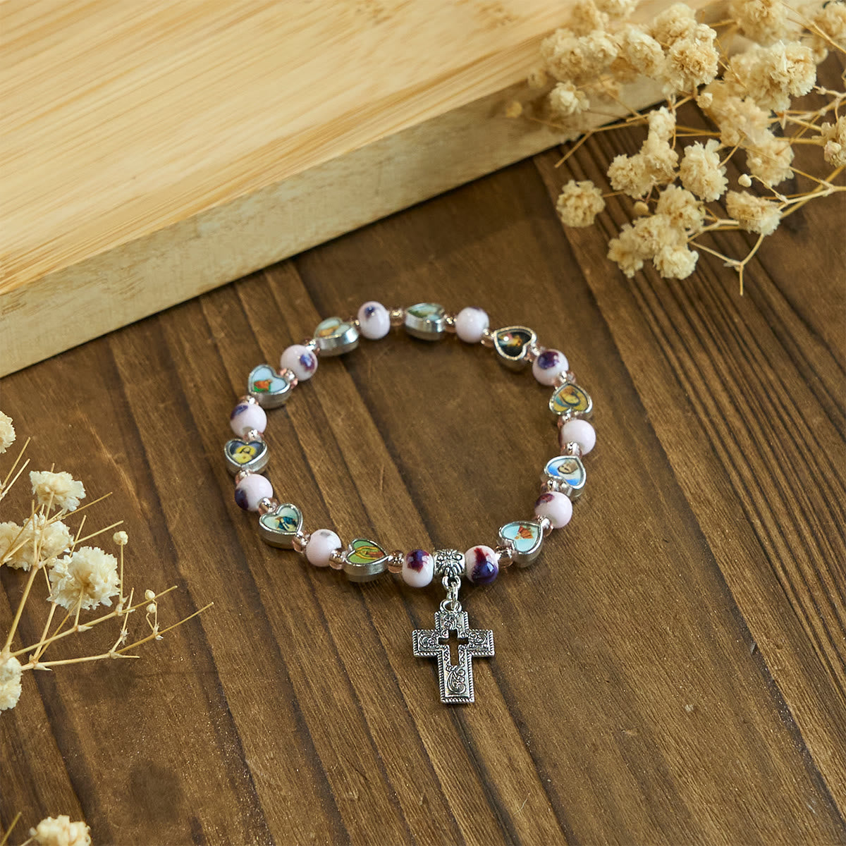 Colorful Glass & Ceramic Bead Bracelets with Cross and Saints Heart Charms