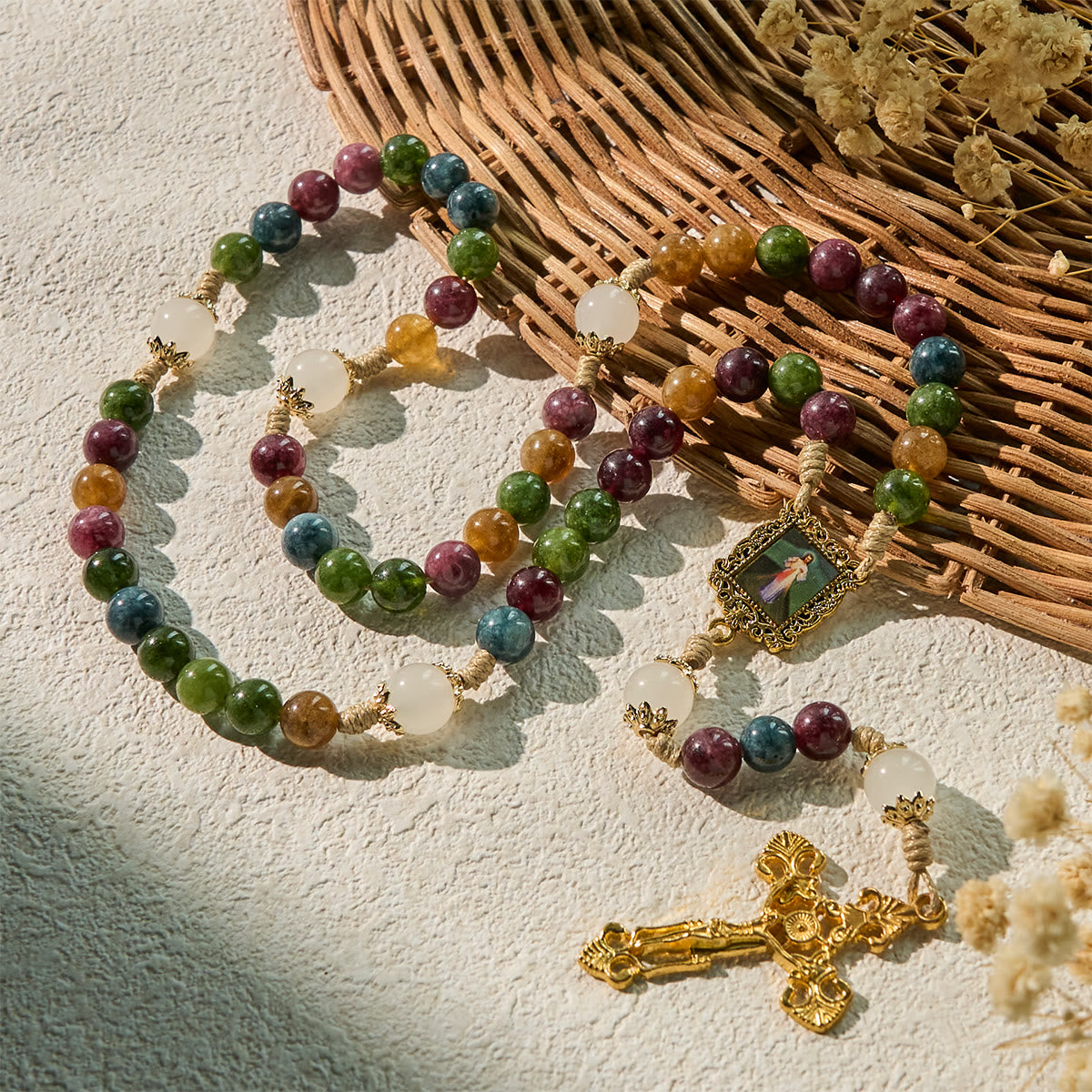 Each colorful bead invites a moment of reflection, and the Divine Mercy square, paired with the golden crucifix, connects you to Christ’s love and sacrifice. It’s a visual and spiritual reminder of faith’s enduring beauty. -