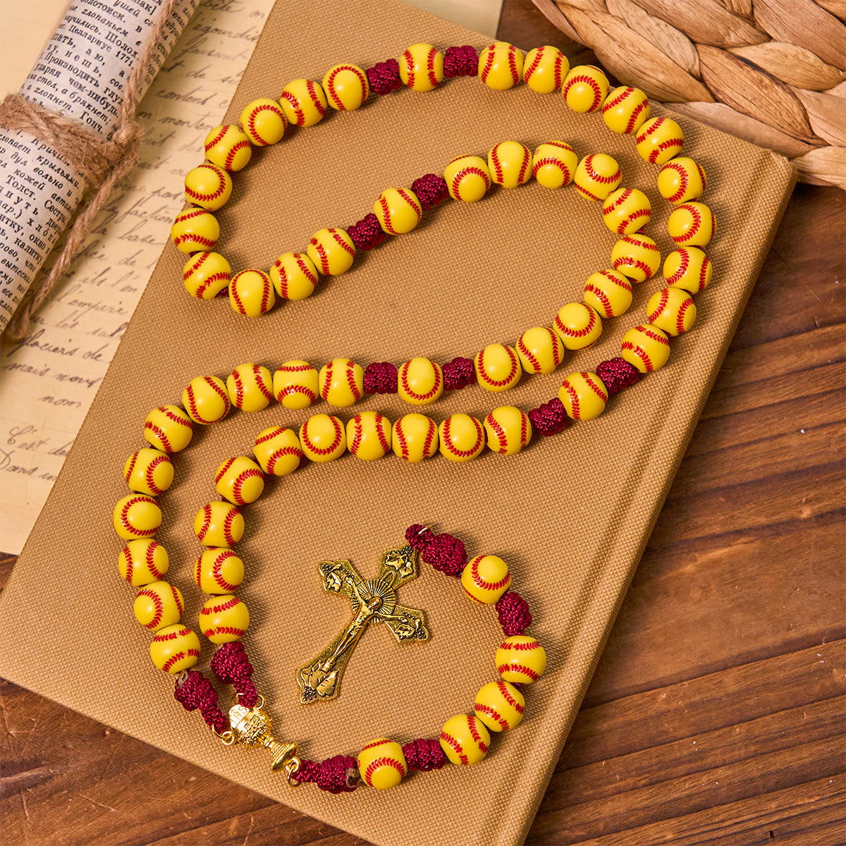 Bright yellow beads with vivid red stitching capture the dynamic energy of softball. This playful yet bold design unites athletic passion with sacred devotion, making it stand out in both faith and sport. -