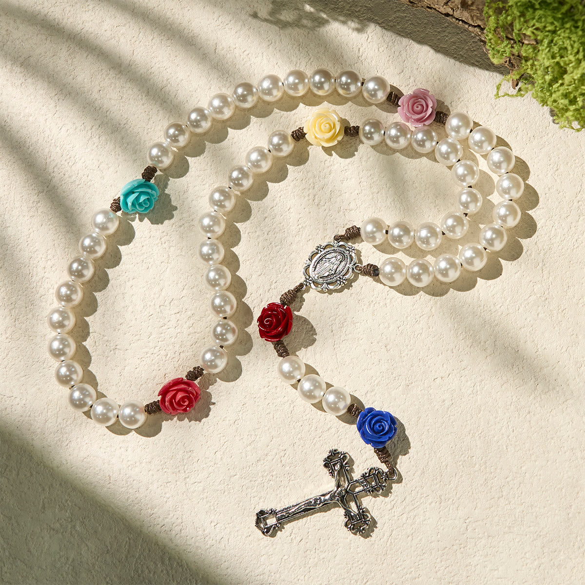 Introducing our Elegant Pearl Rosary with Multicolor Rose Accents, a devotional piece that combines timeless beauty with profound spiritual meaning. -