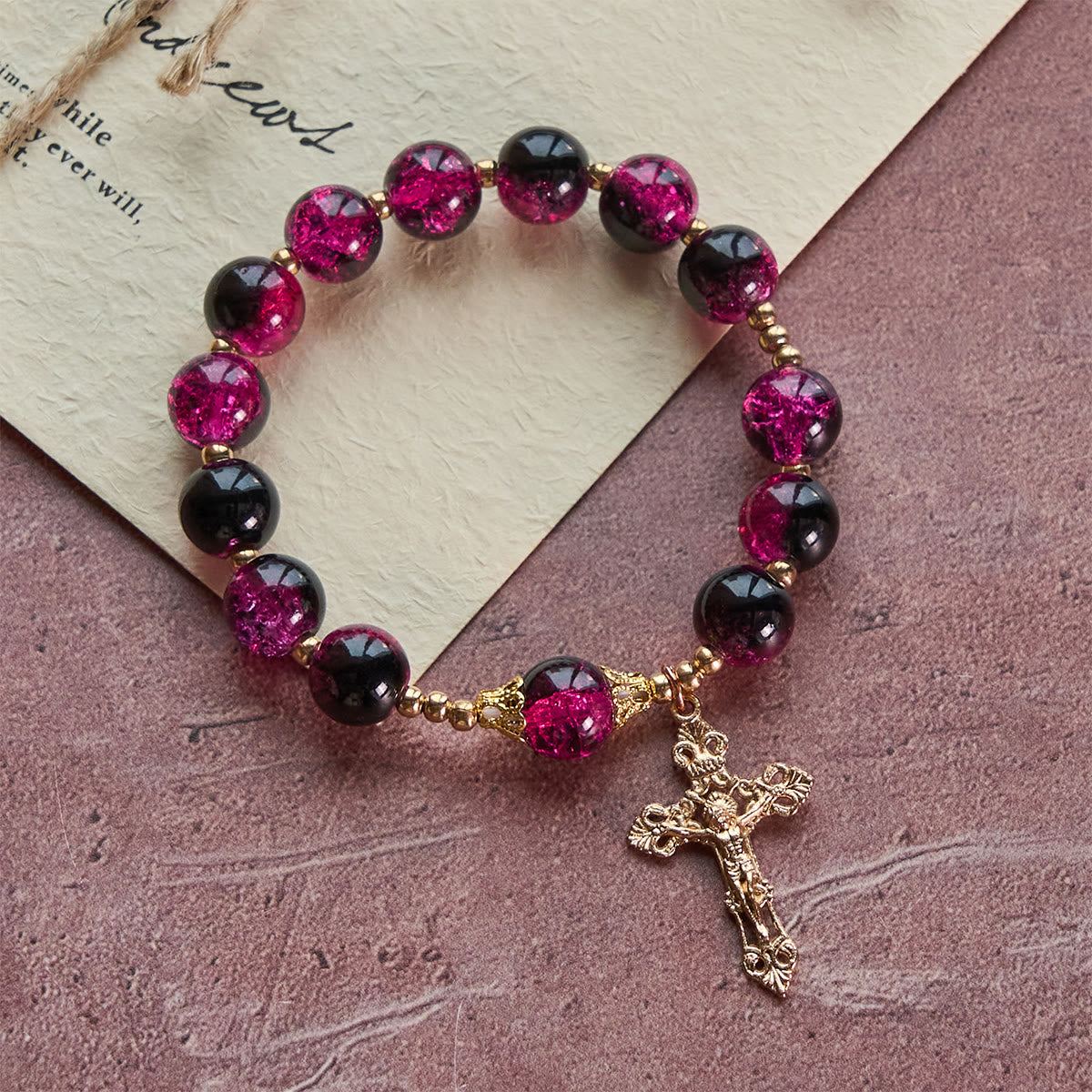 This handcrafted bracelet brings together two divine elements — the depth of faith and the beauty of grace. With black and pink cracked glass beads joined by a radiant golden crucifix, it captures the harmony of devotion: the strength to endure and the love that redeems. -