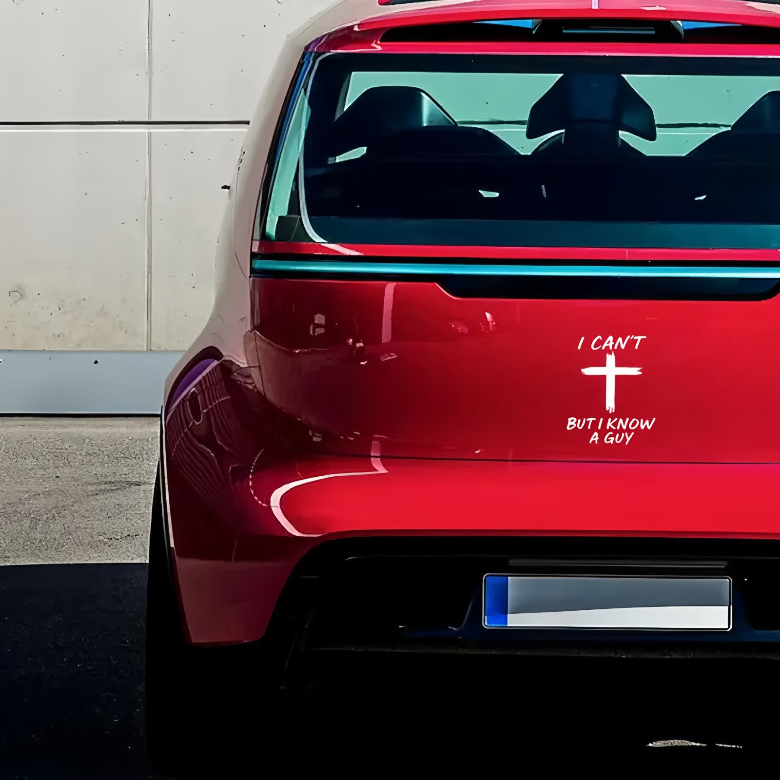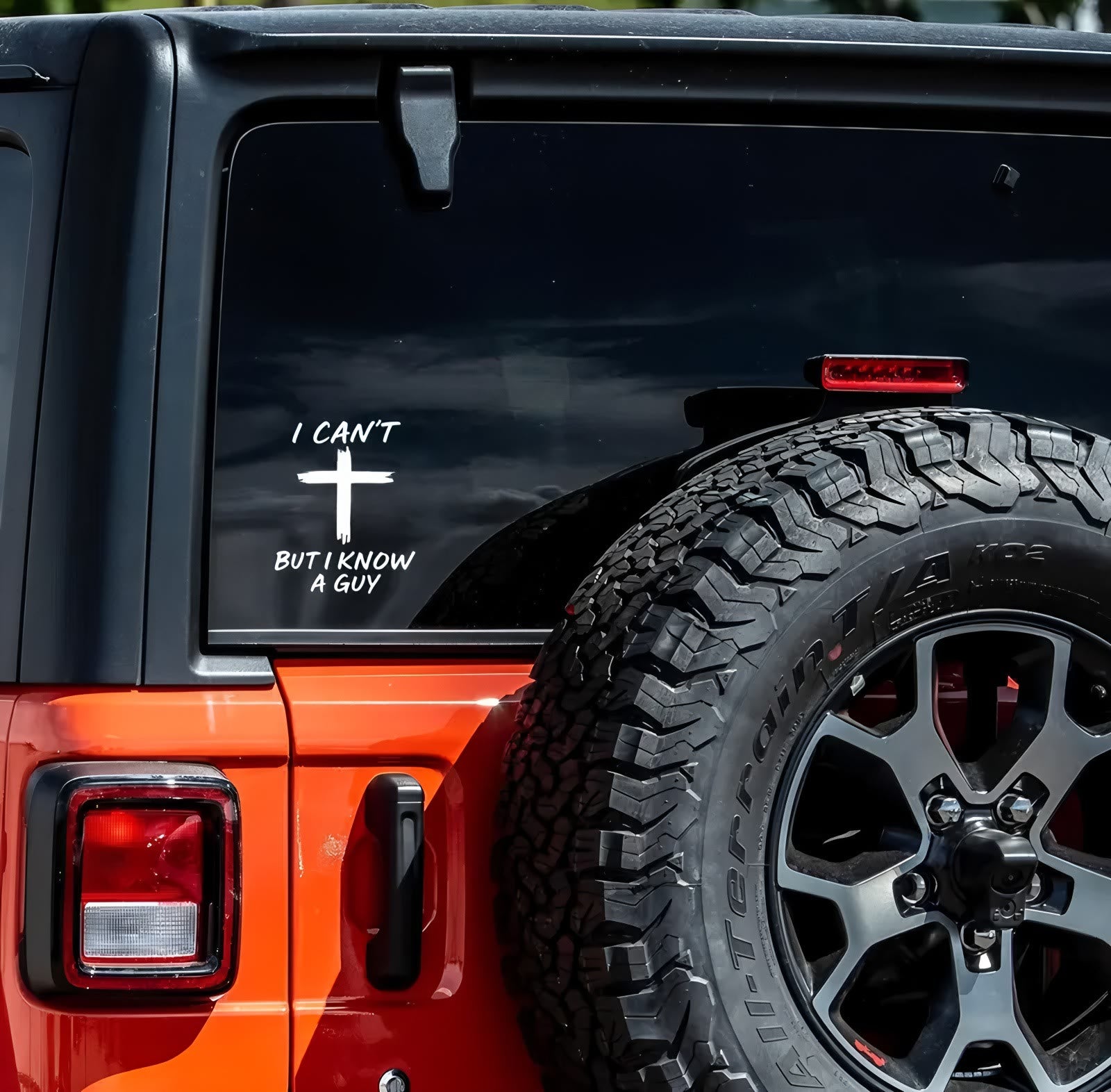 This minimalist decal pairs a hand-drawn cross with the cheeky confession “I CAN’T / BUT I KNOW A GUY,” turning everyday spaces into a quiet witness of trust in Jesus. It’s lighthearted yet reverent—perfect for carrying hope into commute, class, or coffee shop.