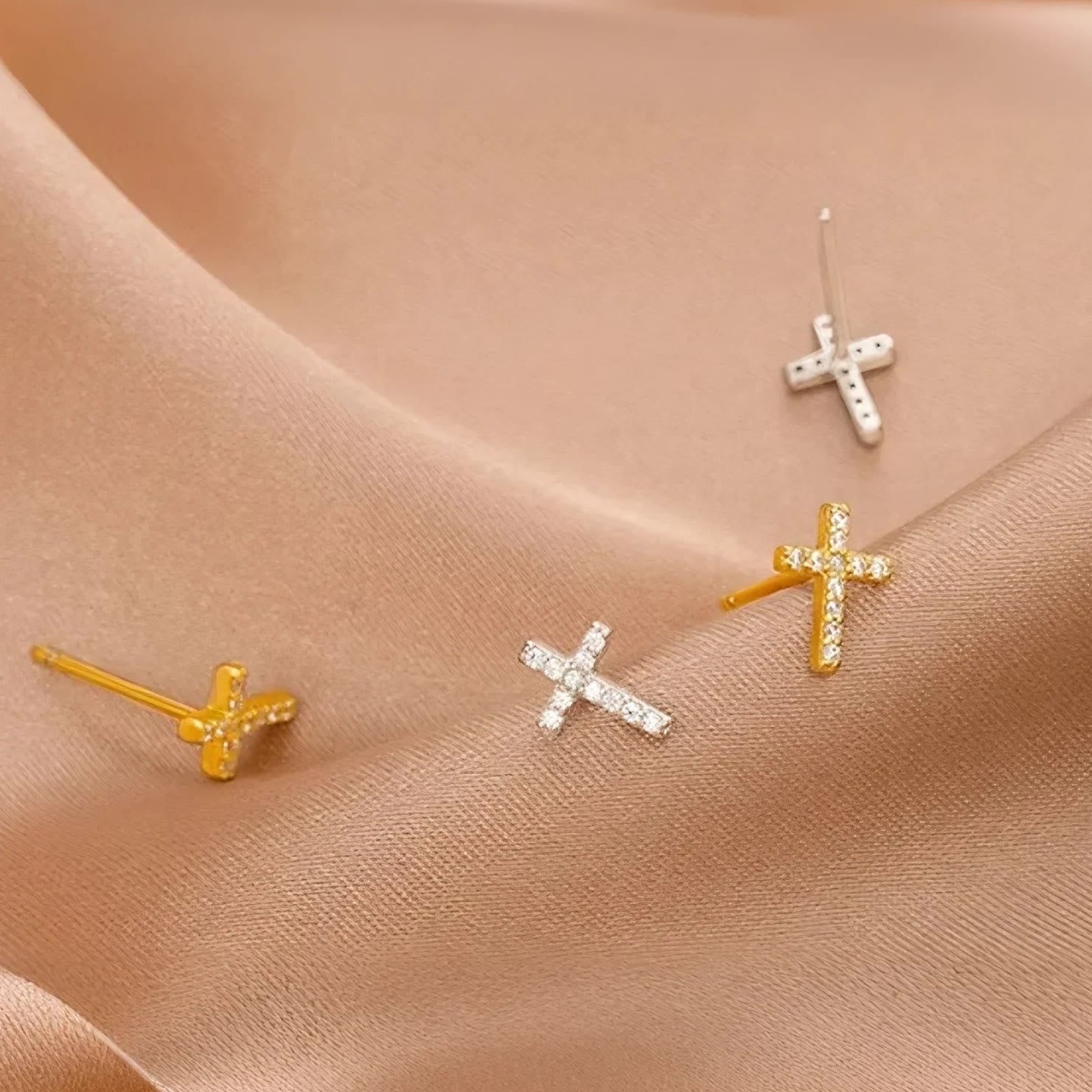 These minimal cross stud earrings—available in silver and gold—offer a low-profile sparkle and skin-friendly S925 posts for calm, comfortable wear. -