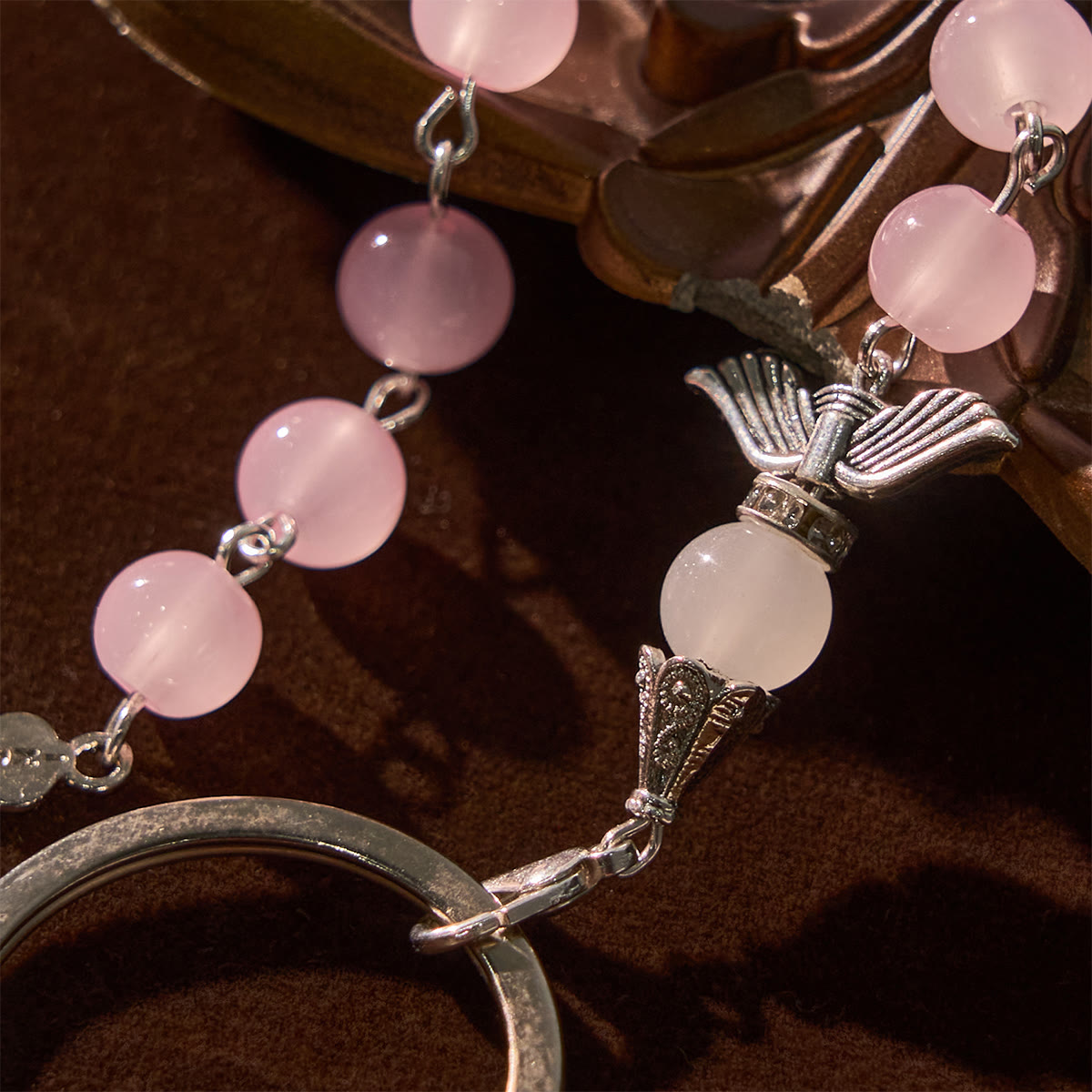 Tri - color gem beads pair with silver angel wing and cross. Meticulously made, it serves as both a keychain and a pocket rosary—carrying angelic blessings wherever you go. -
