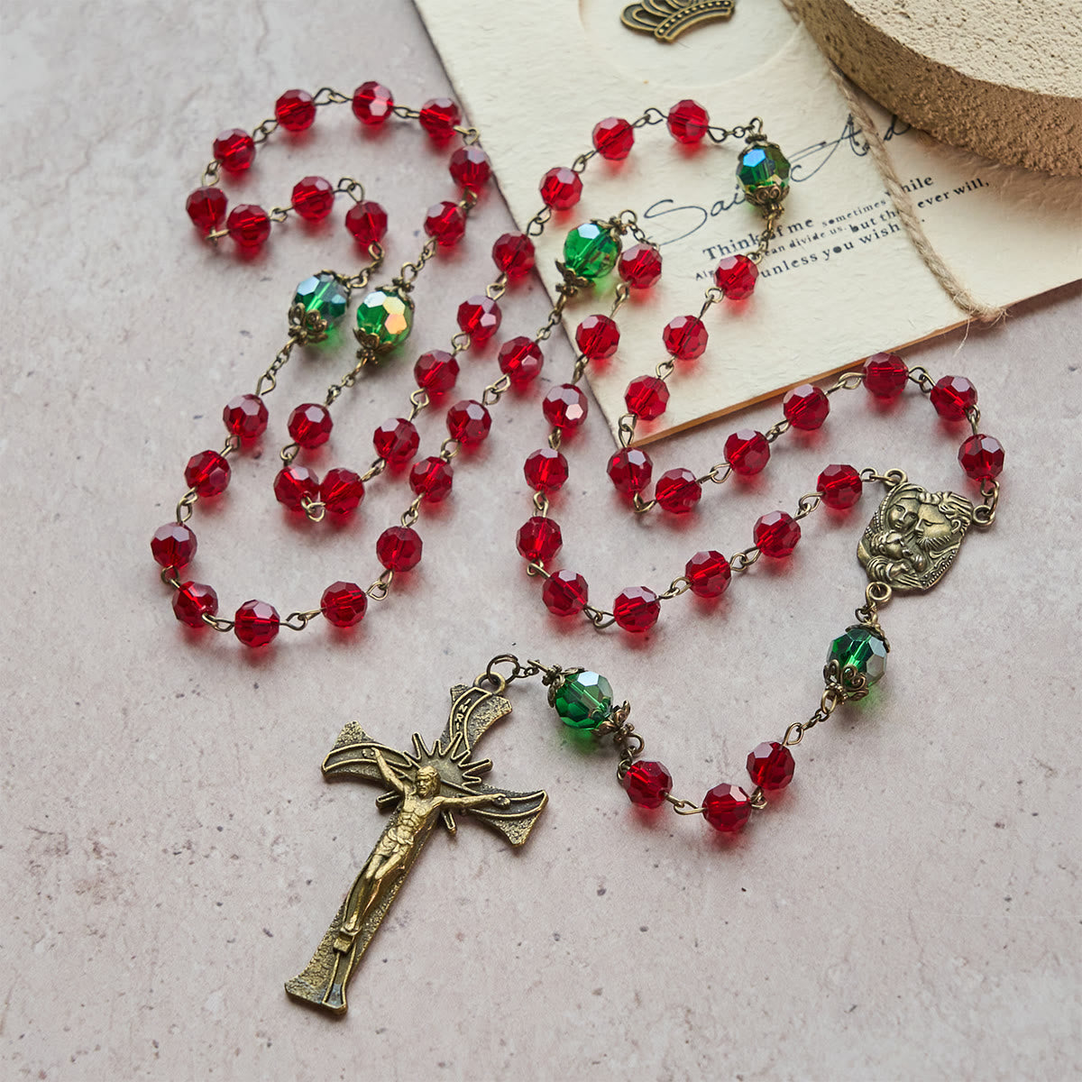 The combination of red and green, accented by antique gold, embodies the joy and reverence of the Nativity season. Its radiant colors mirror the light of Advent candles and the evergreen promise of new life. Every bead shimmers with devotion, transforming prayer into a reflection of Christmas grace. -