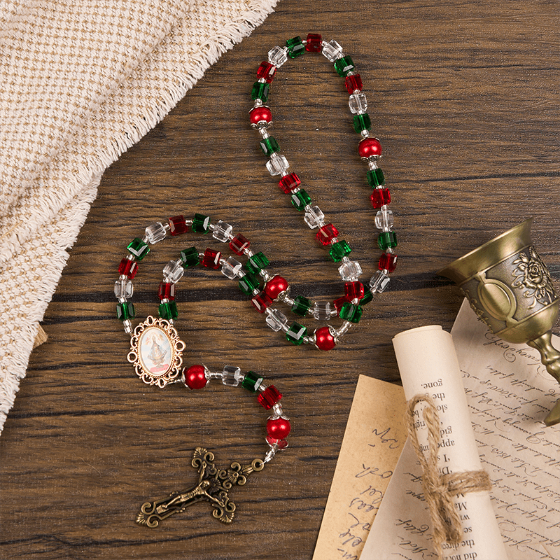 Elevate your prayer experience with our beautifully designed rosary. Each bead and element is thoughtfully chosen to enhance your connection to Christ. The vibrant colors of red, green, and clear beads are meticulously intertwined to reflect the rich tapestry of faith and divine love. -