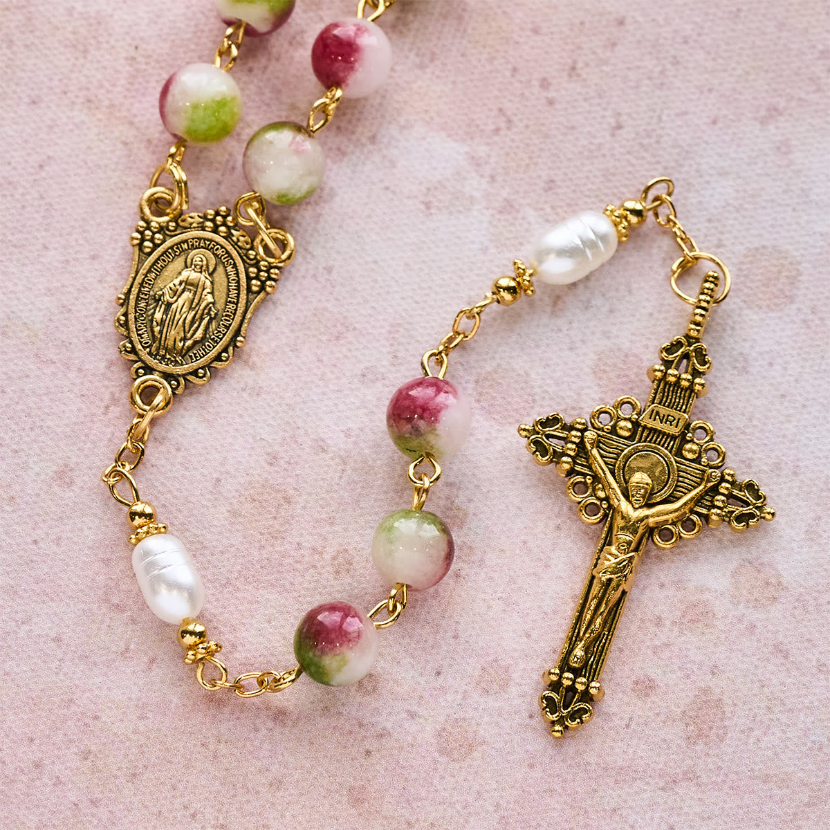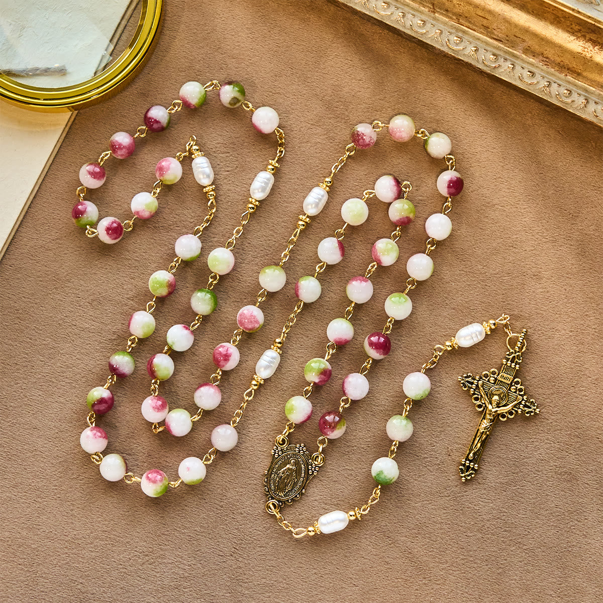 This Vibrant Tourmaline Rosary wraps faith in rich, layered color. The pink-green tourmaline beads (echoing the beauty of God’s creation) glint along the golden chain, while the Mary medal and Christ crucifix anchor every prayer—tying each bead’s warmth to His love and her gentle intercession. -